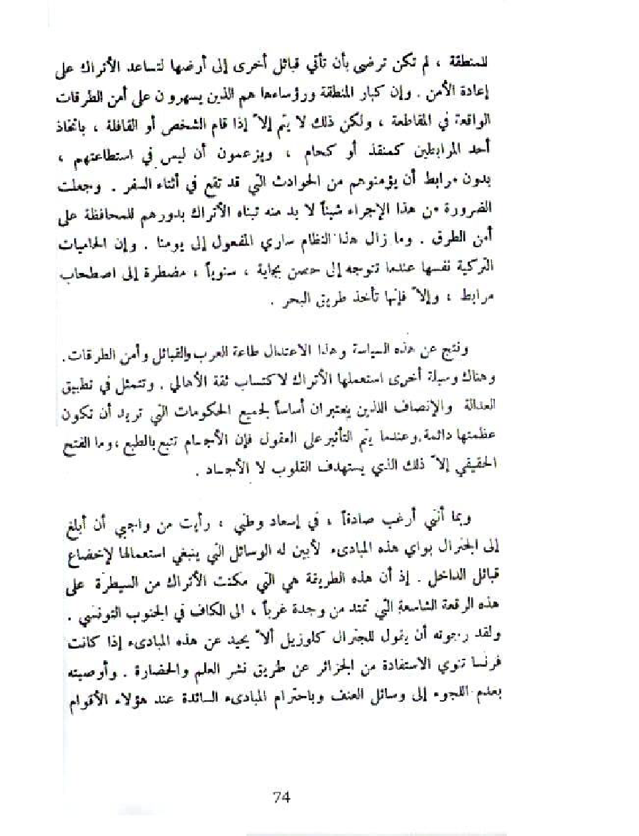 وبما أنني أرغب صادقا، في إسعاد وطني، رأيت من واجبي أن أبلغ إلى الجنرال بواي هذه المبادىء لأبين له الوسائل التي ينبغي استعمالها لإخضاع قبائل الداخل. إذ أن هذه الطريقة هي التي مكنت الأتراك من السيطرة على هذه الرقعة الشاسعة التي تمتد من وجدة غربا، إلى الكاف في الجنوب التونسي. ولقد رجوته أن يقول للجنرال كلوزيل ألا يحيد عن هذه المبادىء إذا كانت فرنسا تنوي الاستفادة من الجزائر عن طريق نشر العلم والحضارة. وأوصيته بعدم اللجوء إلى وسائل العنف وباحترام المبادىء السائدة عند هؤلاء الأقوام