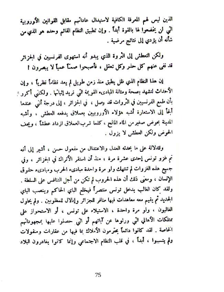 إن هذا النظام الذي ظل يطبق منذ زمن طويل لم يعد نظاما نظريا، وإن الأحداث لتشهد بصحة ومتانة المبادىء القويمة التي نريد إثباتها. ولكنني أكرر بأن طمع الفرنسيين في الثروات قد وصل، في الجزائر، إلى درجة أنني عندما ألجأ إلى الاستعارة أشبه هؤلام الأوروبيين بعملاق يدفعه العطش، وأشبه المدينة بحوض صغير من الماء المالح، كلما شرب العملاق ازداد عطشا، ويجف الحوض ولكن العطش لا يزول.