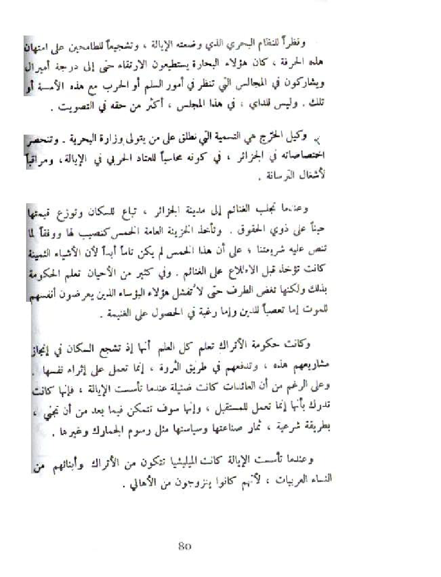ونطرا للنظام البحري الذي وضعته الإيالة، وتشجيعا للطامحين على امتهان هذه الحرفة، كان هؤلاء البحارة يستطيعون الارتقاء حتى إلى درجة أميرال ويشاركون في المجالس التي تنظر في أمور السلم أو الحرب مع هذه الأمة أو تلك. وليس للداي، في هذا المجلس، أكثر من حقه في التصويت.