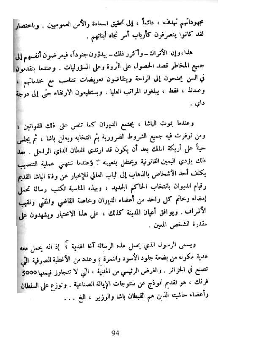 هذا، وإن الأتراك - وأكرر ذلك - يبدؤون جنودا، فيعرضون أنفسهم إلى جميع المخاطر قصد الحصول على الثروة وعلى المسؤوليات. وعندما يتقدمون في السن يجنحون إلى الراحة ويتقاضون تعويضات تتناسب مع خدماتهم، وعندئد، فقط، يبلغون المراتب العليا، ويستطيعون الارتقاء حتى إلى درجة داي.