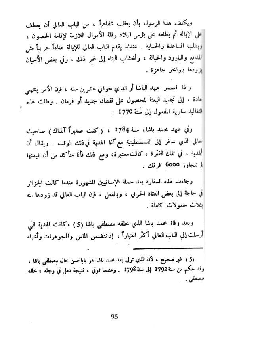وفي عهد محمد باشا، سنة 1784، (كنت صغيرا آنذاك) صاحبت خالي الذي سافر إلى القسطنطينية مع آغا الهدية في ذلك الوقت. ويقال أن الهدية، في تلك الفترة، كانت معتبرة، ومع ذلك فأنا متأكد من أن قيمتها لم تتجاوز 6000 فرنك.