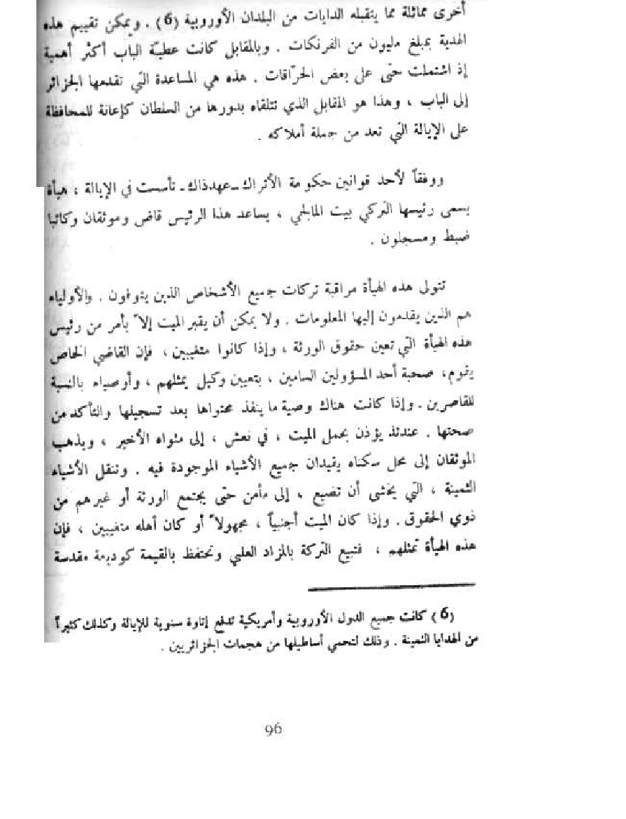 أخرى مماثلة مما يتقبله الدايات من البلدان الأوروبية (¬6) , ويمكن تقييم هذه الهدية بمبلغ مليون من الفرنكات. وبالمقابل كانت عطية الباب أكثر أهمية إذ اشتملت حتى على بعض الحراقات. هذه هي المساعدة التي تقدمها الجزائر إلى الباب، وهذا هو المقابل الذي تتلقاه بدورها من السلطان كإعانة للمحافظة على الإيالة التي تعد من جملة أملاكه.
