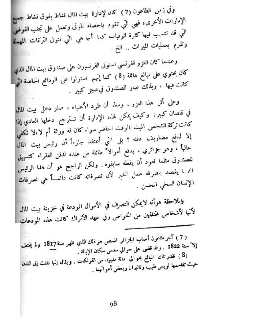 وعلى أثر هذا الغزو، ومنذ أن طرد الأغنياء، صار دخل بيت المال في نقصان كبير، وكيف يمكن لهذه الإدارة أن تسترجع دخلها العادي إذا كانت تركة الشخص الميت بالوقت الحاضر سواء كان له ورثة أم لا، لا تكفي إلا لدفع مصاريف دفنه؟ بل إنني أعتقد جازما أن رئيس بيت المال حاليا، وهو جزائري ; يدفع أموالا طائلة من عنده لدفن الفقراء كتسبيق للصندوق مثلما تعود أن يفعله سابقوه. ولكن الراجح هو أن هذا الرئيس إنما يقصد بتصرفه عمل الخير لأن تصرفاته كانت دائما هي تصرفات الإنسان السخي المحسن.