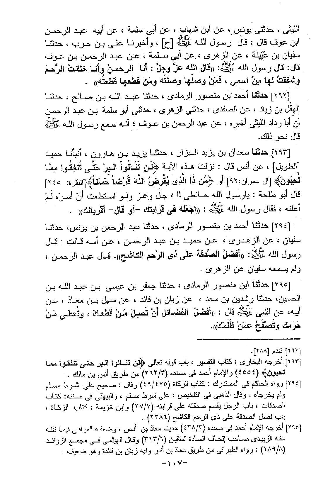 294 - حَدَّثَنَا أَحْمَدُ بْنُ مَنْصُورٍ الرَّمَادِيُّ، حَدَّثَنَا عَبْدُ الرَّحْمَنِ بْنُ يُونُسَ، حَدَّثَنَا سُفْيَانُ، عَنِ الزُّهْرِيِّ، عَنْ حُمَيْدِ بْنِ عَبْدِ الرَّحْمَنِ، عَنْ أُمِّهِ، قَالَتْ: قَالَ رَسُولُ اللَّهِ صَلَّى اللَّهُ عَلَيْهِ وَسَلَّمَ: «§أَفْضَلُ الصَّدَقَةِ عَلَى ذِي الرَّحِمِ الْكَاشِحِ» قَالَ عَبْدُ الرَّحْمَنِ: وَلَمْ يَسْمَعْهُ سُفْيَانُ عَنِ الزُّهْرِيِّ