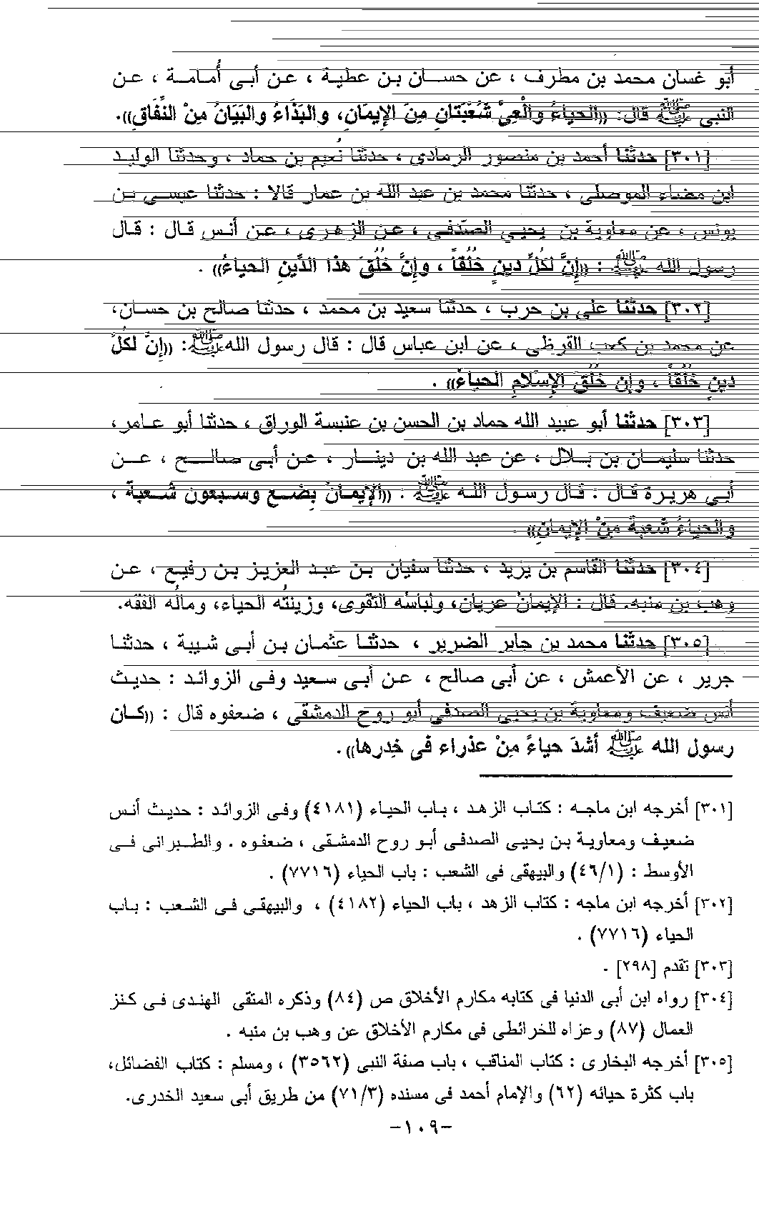 301 - حَدَّثَنَا أَحْمَدُ بْنُ مَنْصُورٍ الرَّمَادِيُّ، حَدَّثَنَا نُعَيْمُ بْنُ حَمَّادٍ، وَحَدَّثَنَا الْوَلِيدُ بْنُ مَضَاءٍ الْمَوْصِلِيُّ، حَدَّثَنَا مُحَمَّدُ بْنُ عَبْدِ اللَّهِ بْنِ عَمَّارٍ، قَالَا: حَدَّثَنَا عِيسَى بْنُ يُونُسَ، عَنْ مُعَاوِيَةَ بْنِ يَحْيَى الصَّدَفِيِّ، عَنِ الزُّهْرِيِّ، عَنْ أَنَسٍ، قَالَ: قَالَ رَسُولُ اللَّهِ صَلَّى اللَّهُ عَلَيْهِ وَسَلَّمَ: «إِنَّ §لِكُلِّ دِينٍ خُلُقًا، وَإِنَّ خُلُقَ هَذَا الدِّينِ الْحَيَاءُ»