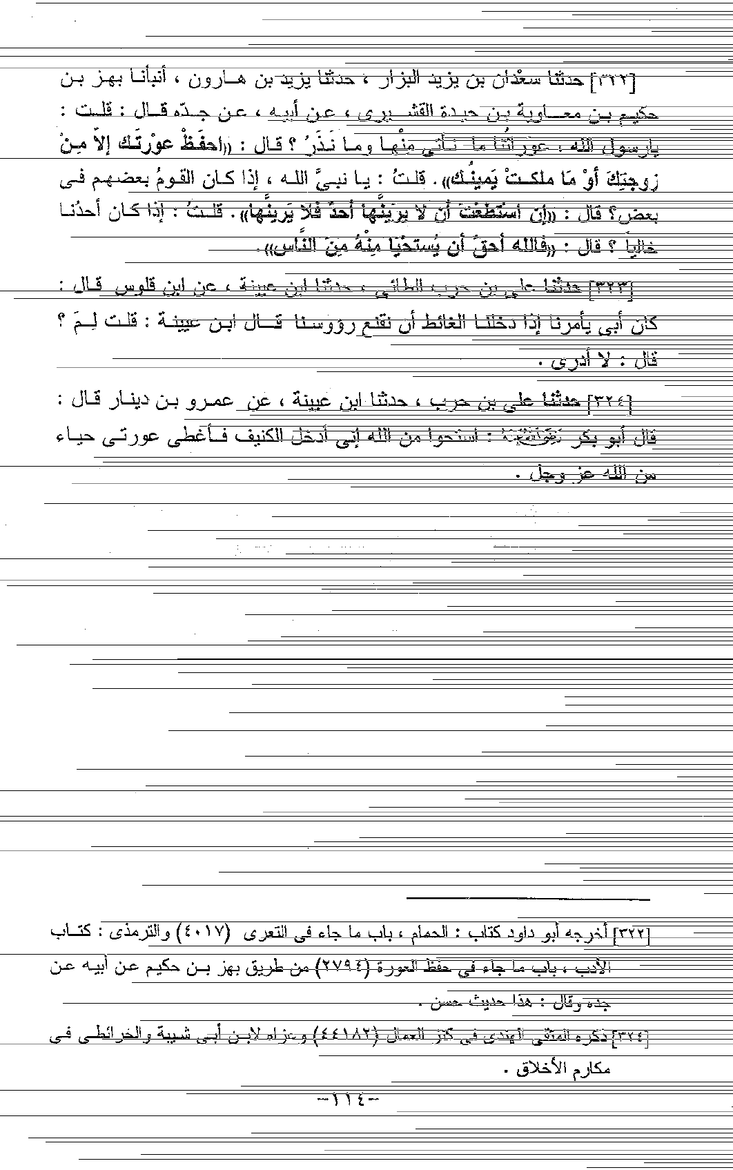 322 - حَدَّثَنَا سَعْدَانُ بْنُ يَزِيدَ الْبَزَّارُ، حَدَّثَنَا يَزِيدُ بْنُ هَارُونَ، أَنْبَأَنَا بَهْزُ بْنُ حَكِيمِ بْنِ مُعَاوِيَةَ بْنِ حَيْدَةَ الْقُشَيْرِيُّ، عَنْ أَبِيهِ، عَنْ جَدِّهِ، قَالَ: قُلْتُ: " يَا رَسُولَ اللَّهِ، §عَوْرَاتُنَا، مَا نَأْتِي مِنْهَا، وَمَا نَذَرُ؟ قَالَ: احْفَظْ عَوْرَتَكَ إِلَّا مِنْ زَوْجَتِكَ، أَوْ مَا مَلَكَتْ يَمِينُكَ قُلْتُ: يَا نَبِيَّ اللَّهِ، إِذَا كَانَ الْقَوْمُ بَعْضُهُمْ فِي بَعْضٍ؟ قَالَ: إِنِ اسْتَطَعْتَ أَنْ لَا يَرَيَنَّهَا أَحَدٌ فَلَا يَرَيَنَّهَا قُلْتُ: إِذَا كَانَ أَحَدُنَا خَالِيًا؟ قَالَ: فَاللَّهُ أَحَقُّ أَنْ يُسْتَحْيَا مِنْهُ مِنَ النَّاسِ "