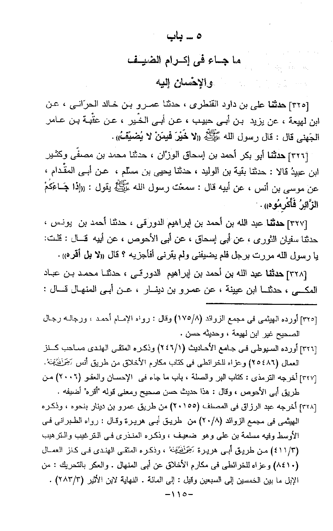 325 - حَدَّثَنَا عَلِيُّ بْنُ دَاوُدَ الْقَنْطَرِيُّ، حَدَّثَنَا عَمْرُو بْنُ خَالِدٍ الْحَرَّانِيُّ، عَنِ ابْنِ لَهِيعَةَ، عَنْ يَزِيدَ بْنِ أَبِي حَبِيبٍ، عَنْ أَبِي الْخَيْرِ، عَنْ عُقْبَةَ بْنِ عَامِرٍ الْجُهَنِيِّ، قَالَ: قَالَ رَسُولُ اللَّهِ صَلَّى اللَّهُ عَلَيْهِ وَسَلَّمَ: «§لَا خَيْرَ فِيمَنْ لَا يُضَيِّفُ»
