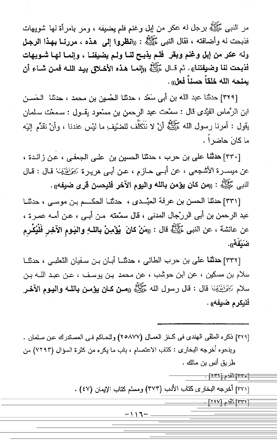332 - حَدَّثَنَا عَلِيُّ بْنُ حَرْبٍ الطَّائِيُّ، حَدَّثَنَا أَبَانُ بْنُ سُفْيَانَ الثَّعْلَبِيُّ، حَدَّثَنَا سَلَّامُ بْنُ مِسْكِينٍ، عَنِ ابْنِ حَوْشَبٍ، عَنْ مُحَمَّدِ بْنِ يُوسُفَ، عَنْ عَبْدِ اللَّهِ بْنِ سَلَامٍ، رَضِيَ اللَّهُ عَنْهُ قَالَ: قَالَ رَسُولُ اللَّهِ صَلَّى اللَّهُ عَلَيْهِ وَسَلَّمَ: «§مَنْ كَانَ يُؤْمِنُ بِاللَّهِ وَالْيَوْمِ الْآخِرِ فَلْيُكْرِمْ ضَيْفَهُ»