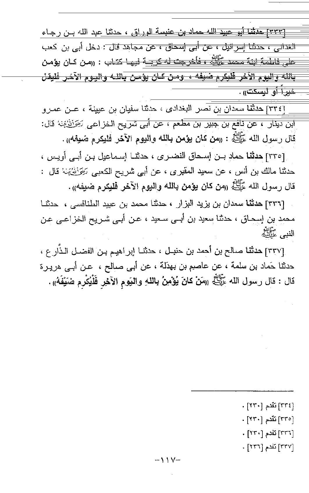 335 - حَدَّثَنَا حَمَّادُ بْنُ إِسْحَاقَ النَّضْرِيُّ، حَدَّثَنَا إِسْمَاعِيلُ بْنُ أَبِي أُوَيْسٍ، حَدَّثَنَا مَالِكُ بْنُ أَنَسٍ، عَنْ سَعِيدٍ الْمَقْبُرِيِّ، عَنْ أَبِي شُرَيْحٍ الْكَعْبِيِّ، رَضِيَ اللَّهُ عَنْهُ قَالَ: قَالَ رَسُولُ اللَّهِ صَلَّى اللَّهُ عَلَيْهِ وَسَلَّمَ: «§مَنْ كَانَ يُؤْمِنُ بِاللَّهِ وَالْيَوْمِ الْآخِرِ فَلْيُكْرِمْ ضَيْفَهُ»