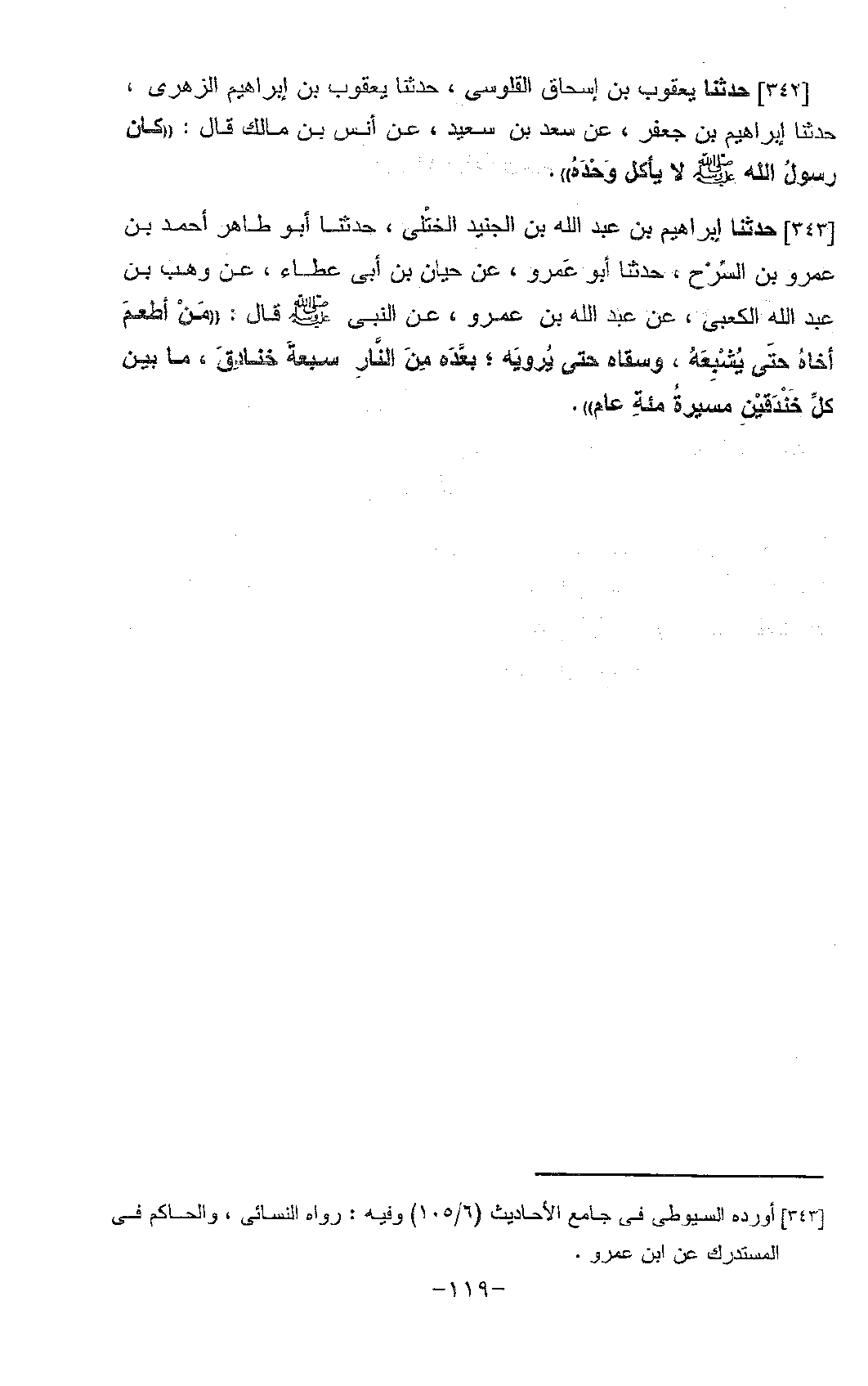 343 - حَدَّثَنَا إِبْرَاهِيمُ بْنُ عَبْدِ اللَّهِ بْنِ الْجُنَيْدِ الْخُتُلِّيُّ، حَدَّثَنَا أَبُو طَاهِرٍ أَحْمَدُ بْنُ عَمْرِو بْنِ السَّرْحِ، حَدَّثَنَا أَبُو عَمْرٍو، عَنْ حَيَّانَ بْنِ أَبِي عَطَاءٍ، عَنْ وَهْبِ بْنِ عَبْدِ اللَّهِ الْكَعْبِيِّ، عَنْ عَبْدِ اللَّهِ بْنِ عَمْرٍو، عَنِ النَّبِيِّ صَلَّى اللَّهُ عَلَيْهِ وَسَلَّمَ قَالَ: «§مَنْ أَطْعَمَ أَخَاهُ حَتَّى يُشْبِعَهُ، وَسَقَاهُ حَتَّى يَرْوِيَهُ، بَعَّدَهُ مِنَ النَّارِ سَبْعَةَ خَنَادِقَ، مَا بَيْنَ كُلِّ خَنْدَقَيْنِ مَسِيرَةُ مِائَةِ عَامٍ»