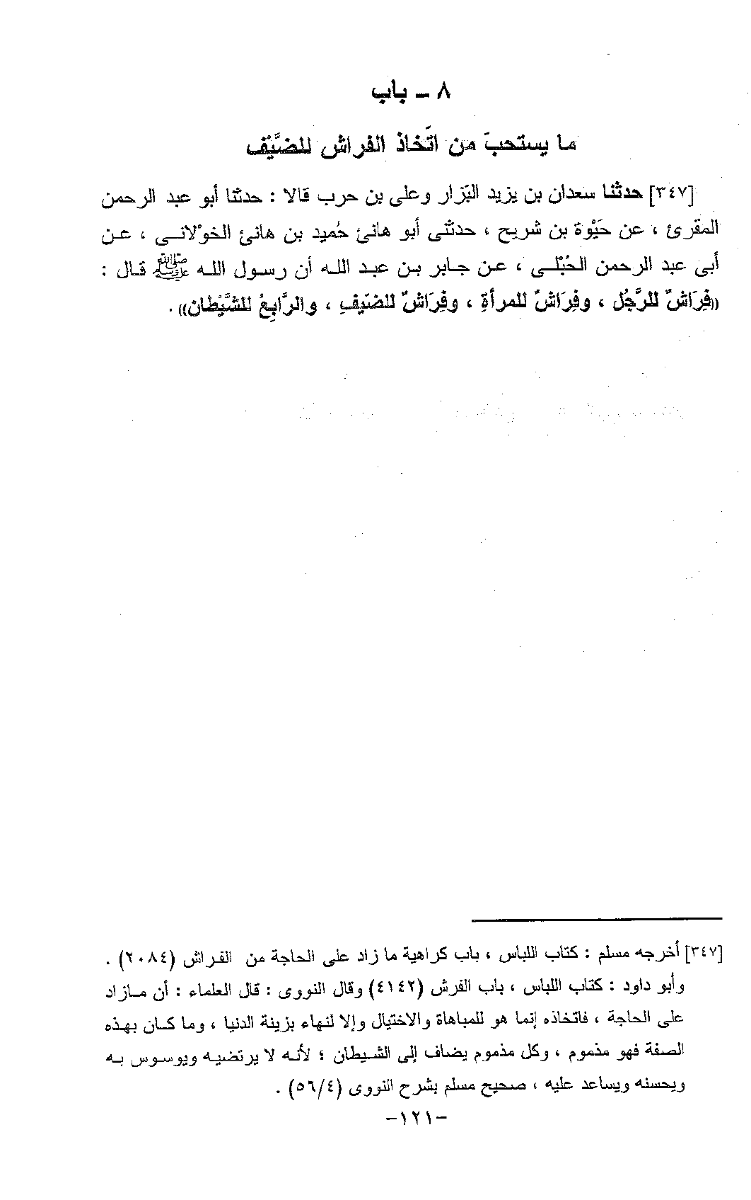 347 - حَدَّثَنَا سَعْدَانُ بْنُ يَزِيدَ الْبَزَّارُ، وَعَلِيُّ بْنُ حَرْبٍ، قَالَا: حَدَّثَنَا أَبُو عَبْدِ الرَّحْمَنِ الْمُقْرِئُ، عَنْ حَيْوَةَ بْنِ شُرَيْحٍ، حَدَّثَنِي أَبُو هَانِئٍ حُمَيْدُ بْنُ هَانِئٍ الْخَوْلَانِيُّ، عَنْ أَبِي عَبْدِ الرَّحْمَنِ الْحُبُلِيِّ، عَنْ جَابِرِ بْنِ عَبْدِ اللَّهِ أَنَّ رَسُولَ اللَّهِ صَلَّى اللَّهُ عَلَيْهِ وَسَلَّمَ قَالَ: «§فِرَاشٌ لِلرَّجُلِ، وَفِرَاشٌ لِلْمَرْأَةِ، وَفِرَاشٌ لِلضَّيْفِ، وَالرَّابِعُ لِلشَّيْطَانِ»