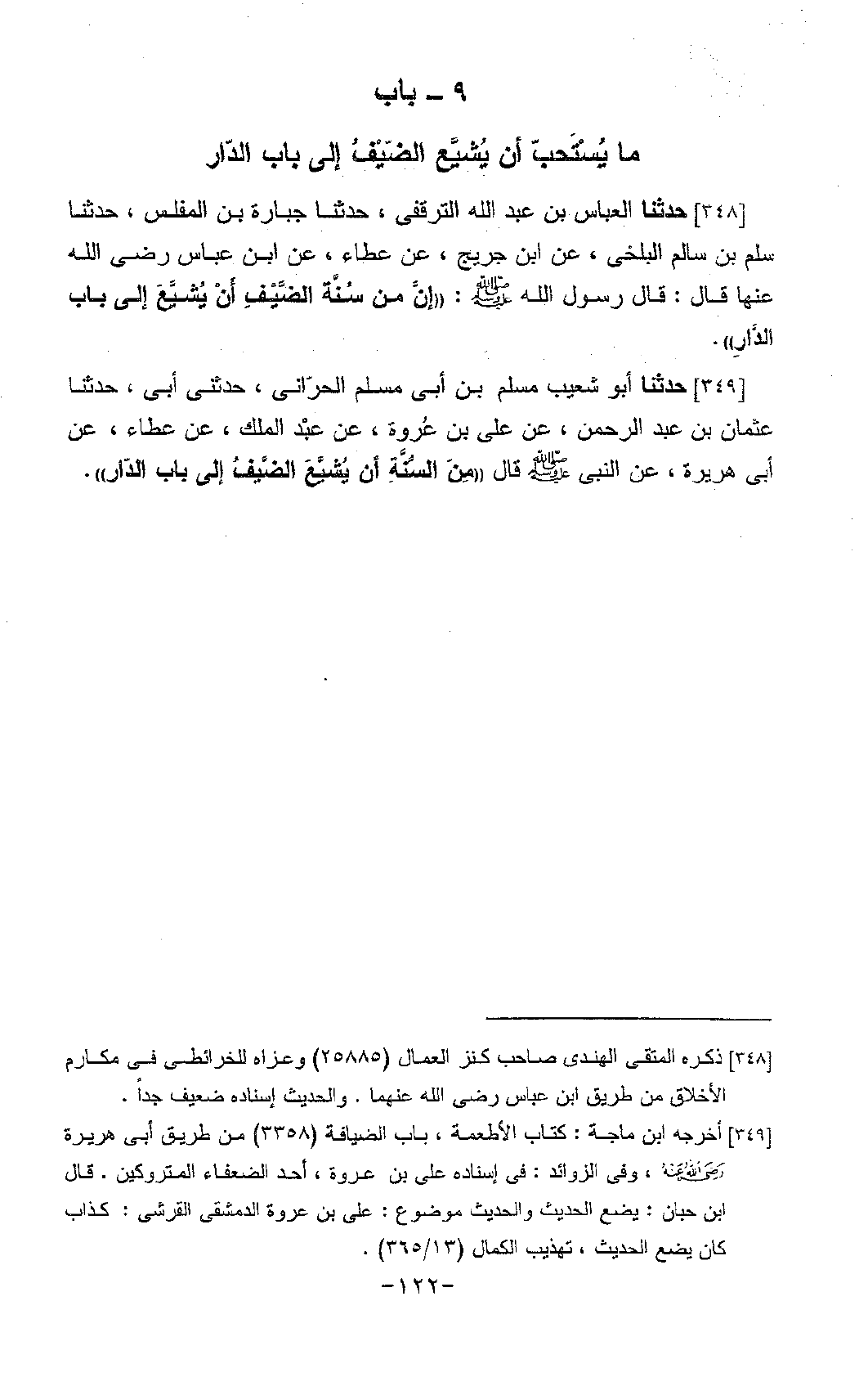 348 - حَدَّثَنَا الْعَبَّاسُ بْنُ عَبْدِ اللَّهِ التَّرْقُفِيُّ، حَدَّثَنَا جُبَارَةُ بْنُ الْمُغَلِّسِ، حَدَّثَنَا سَلْمُ بْنُ سَالِمٍ الْبَلْخِيُّ، عَنِ ابْنِ جُرَيْجٍ، عَنْ عَطَاءٍ، عَنِ ابْنِ عَبَّاسٍ رَضِيَ اللَّهُ عَنْهُ قَالَ: قَالَ رَسُولُ اللَّهِ صَلَّى اللَّهُ عَلَيْهِ وَسَلَّمَ: «إِنَّ §مِنْ سُنَّةِ الضَّيْفِ أَنْ يُشَيَّعَ إِلَى بَابِ الدَّارِ»