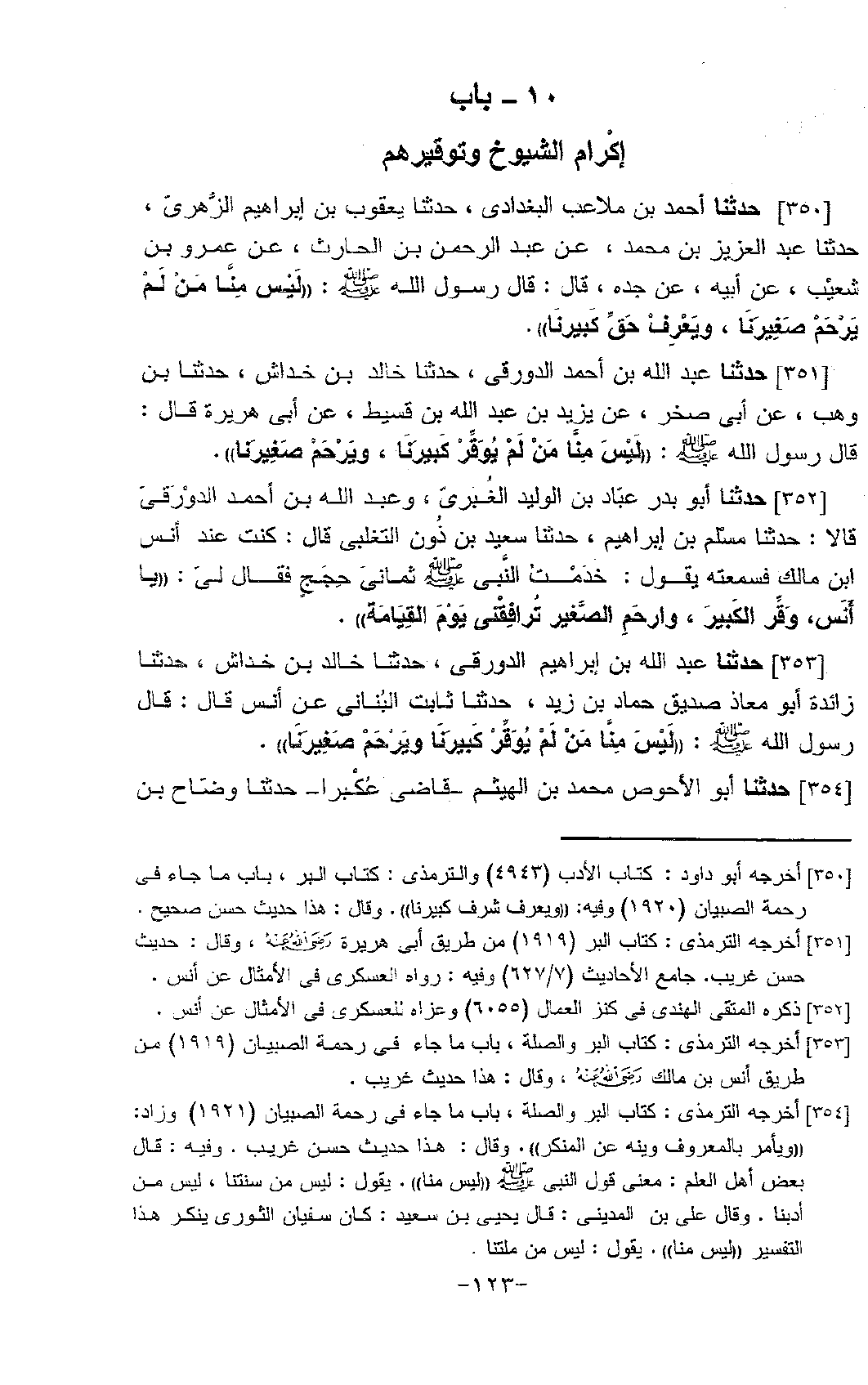 354 - حَدَّثَنَا أَبُو الْأَحْوَصِ مُحَمَّدُ بْنُ الْهَيْثَمِ قَاضِي عُكْبَرَا، حَدَّثَنَا وَضَّاحُ بْنُ -[124]- يَحْيَى، حَدَّثَنَا أَبُو بَكْرِ بْنُ عَيَّاشٍ، عَنْ عَاصِمٍ، عَنْ زِرٍّ، عَنْ عَبْدِ اللَّهِ بْنِ عَبَّاسٍ، قَالَ: قَالَ رَسُولُ اللَّهِ صَلَّى اللَّهُ عَلَيْهِ وَسَلَّمَ: «§لَيْسَ مِنَّا مَنْ لَمْ يَرْحَمْ صَغِيرَنَا، وَيُوَقِّرْ كَبِيرَنَا»