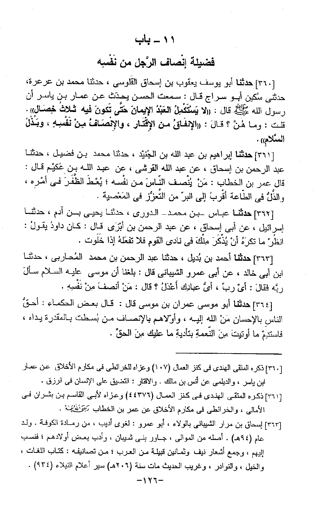 360 - حَدَّثَنَا أَبُو يُوسُفَ يَعْقُوبُ بْنُ إِسْحَاقَ الْقُلُوسِيُّ، حَدَّثَنَا مُحَمَّدُ بْنُ عَرْعَرَةَ، حَدَّثَنِي سُكَيْنٌ أَبُو سِرَاجٍ، قَالَ: سَمِعْتُ الْحَسَنَ، يُحَدِّثُ عَنْ عَمَّارِ بْنِ يَاسِرٍ، أَنَّ رَسُولَ اللَّهِ صَلَّى اللَّهُ عَلَيْهِ وَسَلَّمَ قَالَ: " §لَا يَسْتَكْمِلُ الْعَبْدُ الْإِيمَانَ حَتَّى تَكُونَ فِيهِ ثَلَاثُ خِصَالٍ قُلْتُ: وَمَا هُنَّ؟ قَالَ: الْإِنْفَاقُ مِنَ الْإِقْتَارِ، وَالْإِنْصَافُ مِنْ نَفْسِهِ، وَبَذْلُ السَّلَامِ "