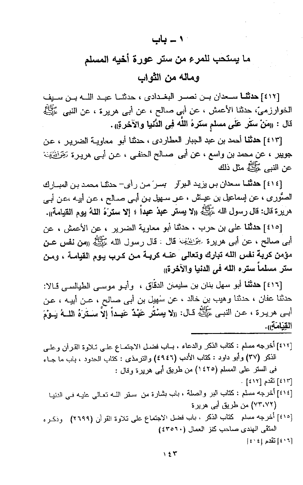 412 - حَدَّثَنَا سَعْدَانُ بْنُ نَصْرٍ الْبَغْدَادِيُّ، حَدَّثَنَا عَبْدُ اللَّهِ بْنُ سَيْفٍ الْخُوَارِزْمِيُّ، حَدَّثَنَا الْأَعْمَشُ، عَنْ أَبِي صَالِحٍ، عَنْ أَبِي هُرَيْرَةَ، عَنِ النَّبِيِّ صَلَّى اللَّهُ عَلَيْهِ وَسَلَّمَ قَالَ: «§مَنْ سَتَرَ عَلَى مُسْلِمٍ سَتَرَهُ اللَّهُ فِي الدُّنْيَا وَالْآخِرَةِ»