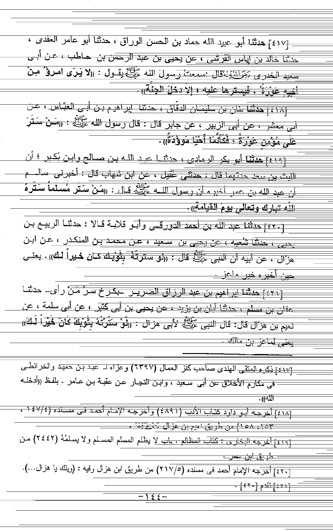 417 - حَدَّثَنَا أَبُو عُبَيْدِ اللَّهِ حَمَّادُ بْنُ الْحَسَنِ الْوَرَّاقُ، حَدَّثَنَا أَبُو عَامِرٍ الْعَقَدِيُّ، حَدَّثَنَا خَالِدُ بْنُ إِيَاسٍ الْقُرَشِيُّ، عَنْ يَحْيَى بْنِ عَبْدِ الرَّحْمَنِ بْنِ حَاطِبٍ، عَنْ أَبِي سَعِيدٍ الْخُدْرِيِّ، رَضِيَ اللَّهُ عَنْهُ قَالَ: سَمِعْتُ رَسُولَ اللَّهِ صَلَّى اللَّهُ عَلَيْهِ وَسَلَّمَ يَقُولُ: «§لَا يَرَى امْرُؤٌ مِنْ أَخِيهِ عَوْرَةً، فَيَسْتُرُهَا عَلَيْهِ؛ إِلَّا دَخَلَ الْجَنَّةَ»