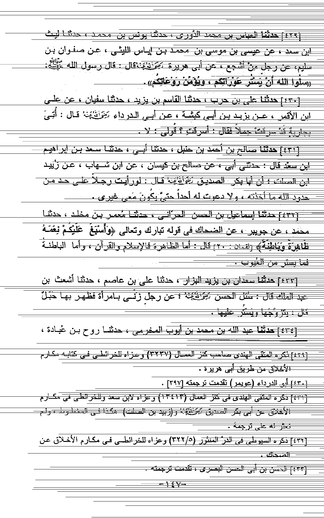 432 - حَدَّثَنَا إِسْمَاعِيلُ بْنُ الْحَسَنِ الْحَرَّانِيُّ، حَدَّثَنَا مَعْمَرُ بْنُ مَخْلَدٍ، حَدَّثَنَا مُحَمَّدٌ، عَنْ جُوَيْبِرٍ، عَنِ الضَّحَّاكِ، فِي قَوْلِهِ تَبَارَكَ وَتَعَالَى: " {§وَأَسْبَغَ عَلَيْكُمْ نِعَمَهُ ظَاهِرَةً وَبَاطِنَةً} [لقمان: 20] ، قَالَ: أَمَّا الظَّاهِرُ فَالْإِسْلَامُ وَالْقُرْآنُ، وَأَمَّا الْبَاطِنَةُ فَمَا يَسْتُرُ مِنَ الْعُيُوبِ "
