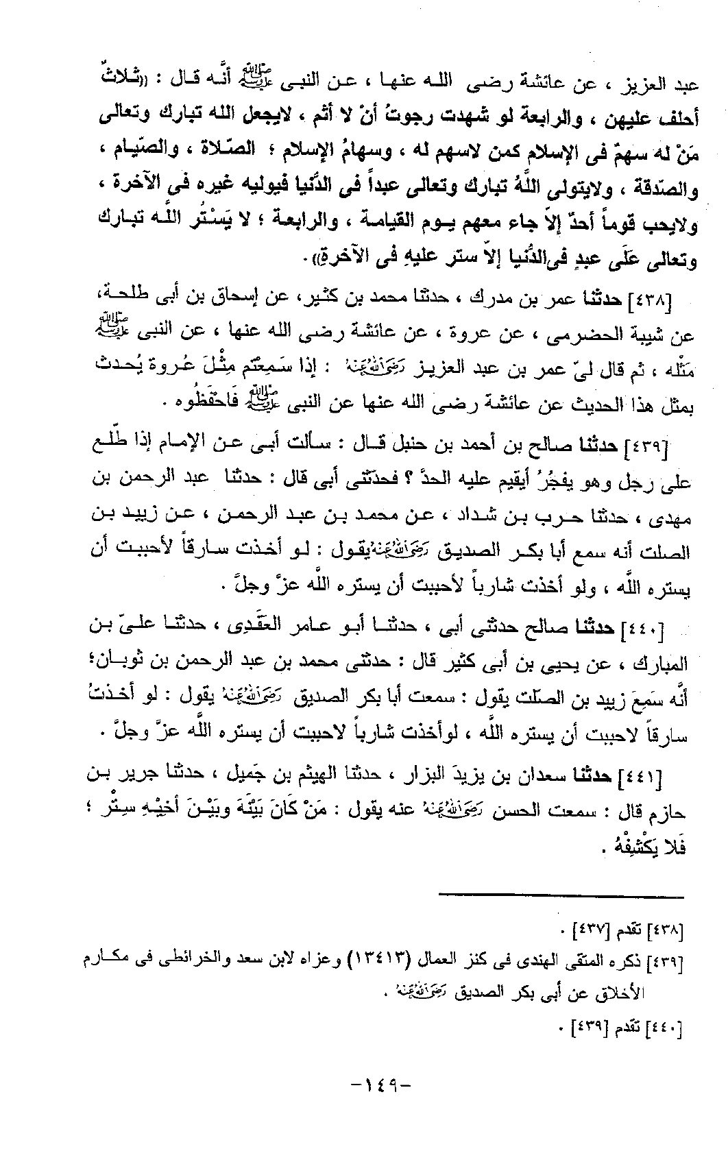 439 - حَدَّثَنَا صَالِحُ بْنُ أَحْمَدَ بْنِ حَنْبَلٍ، قَالَ: سَأَلْتُ أَبِي عَنِ الْإِمَامِ، إِذَا طَلَعَ عَلَى رَجُلٍ وَهُوَ يَفْجُرُ، أَيُقِيمُ عَلَيْهِ الْحَدَّ؟ فَحَدَّثَنِي أَبِي قَالَ: حَدَّثَنَا عَبْدُ الرَّحْمَنِ بْنُ مَهْدِيٍّ، حَدَّثَنَا حَرْبُ بْنُ شَدَّادٍ، عَنْ مُحَمَّدِ بْنِ عَبْدِ الرَّحْمَنِ، عَنْ زُبَيْدِ بْنِ الصَّلْتِ أَنَّهُ سَمِعَ أَبَا بَكْرٍ الصِّدِّيقَ رَضِيَ اللَّهُ عَنْهُ يَقُولُ: «§لَوْ أَخَذْتُ سَارِقًا لَأَحْبَبْتُ أَنْ يَسْتُرَهُ اللَّهُ، وَلَوْ أَخَذْتُ شَارِبًا لَأَحْبَبْتُ أَنْ يَسْتُرَهُ اللَّهُ عَزَّ وَجَلَّ»