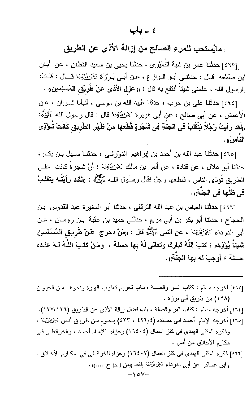 465 - حَدَّثَنَا عَبْدُ اللَّهِ بْنُ أَحْمَدَ بْنِ إِبْرَاهِيمَ الدَّوْرَقِيُّ، حَدَّثَنَا سَهْلُ بْنُ بَكَّارٍ، حَدَّثَنَا أَبُو هِلَالٍ، عَنْ قَتَادَةَ، عَنْ أَنَسِ بْنِ مَالِكٍ، رَضِيَ اللَّهُ عَنْهُ " §أَنَّ شَجَرَةً كَانَتْ عَلَى الطَّرِيقِ تُؤْذِي النَّاسَ، فَقَطَعَهَا رَجُلٌ، فَقَالَ رَسُولُ اللَّهِ صَلَّى اللَّهُ عَلَيْهِ وَسَلَّمَ: لَقَدْ رَأَيْتُهُ يَتَقَلَّبُ فِي ظِلِّهَا فِي الْجَنَّةِ "