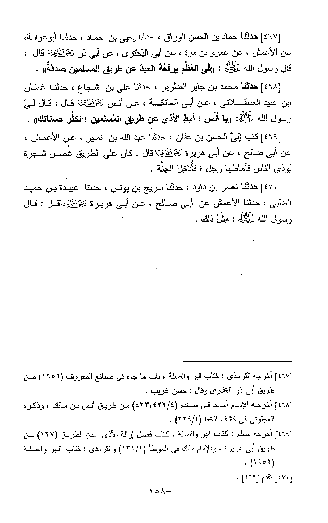 467 - حَدَّثَنَا حَمَّادُ بْنُ الْحَسَنِ الْوَرَّاقُ، حَدَّثَنَا يَحْيَى بْنُ حَمَّادٍ، حَدَّثَنَا أَبُو عَوَانَةَ، عَنِ الْأَعْمَشِ، عَنْ عَمْرِو بْنِ مُرَّةَ، عَنْ أَبِي الْبْحْتَرِيِّ، عَنْ أَبِي ذَرٍّ، رَضِيَ اللَّهُ عَنْهُ قَالَ: قَالَ رَسُولُ اللَّهِ صَلَّى اللَّهُ عَلَيْهِ وَسَلَّمَ: «§فِي الْعَظْمِ يَرْفَعُهُ الْعَبْدُ عَنْ طَرِيقِ الْمُسْلِمِينَ صَدَقَةٌ»