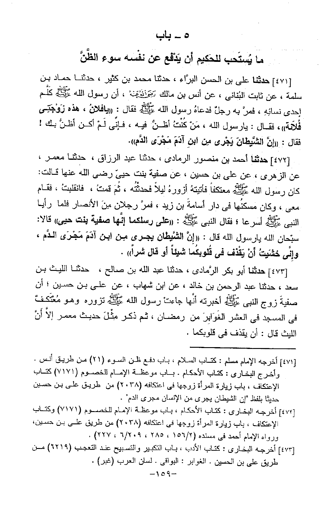471 - حَدَّثَنَا عَلِيُّ بْنُ الْحَسَنِ الْبَرَّاءُ، حَدَّثَنَا مُحَمَّدُ بْنُ كَثِيرٍ، حَدَّثَنَا حَمَّادُ بْنُ سَلَمَةَ، عَنْ ثَابِتٍ الْبُنَانِيِّ، عَنْ أَنَسِ بْنِ مَالِكٍ، رَضِيَ اللَّهُ عَنْهُ §أَنَّ رَسُولَ اللَّهِ صَلَّى اللَّهُ عَلَيْهِ وَسَلَّمَ كَلَّمَ إِحْدَى نِسَائِهِ، فَمَرَّ بِهِ رَجُلٌ، فَدَعَاهُ رَسُولُ اللَّهِ صَلَّى اللَّهُ عَلَيْهِ وَسَلَّمَ، فَقَالَ: «يَا فُلَانُ، هَذِهِ زَوْجَتِي فُلَانَةُ» ، فَقَالَ: يَا رَسُولَ اللَّهِ، مَنْ كُنْتُ أَظُنُّ فِيهِ، فَإِنِّي لَمْ أَكُنْ أَظُنُّ بِكَ فَقَالَ: «إِنَّ الشَّيْطَانَ يَجْرِي مِنَ ابْنِ آدَمَ مَجْرَى الدَّمِ»