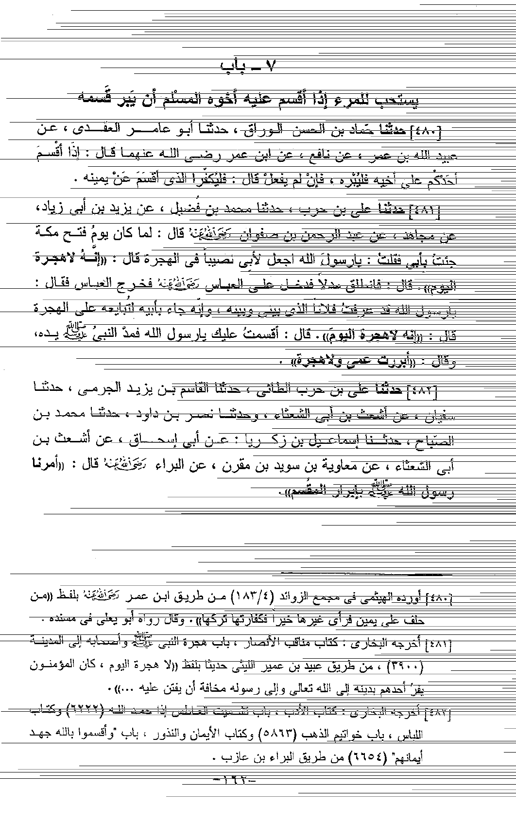 482 - حَدَّثَنَا عَلِيُّ بْنُ حَرْبٍ الطَّائِيُّ، حَدَّثَنَا الْقَاسِمُ بْنُ يَزِيدَ الْجَرْمِيُّ، حَدَّثَنَا سُفْيَانُ، عَنْ أَشْعَثَ بْنِ أَبِي الشَّعْثَاءِ، وَحَدَّثَنَا نَصْرُ بْنُ دَاوُدَ، حَدَّثَنَا مُحَمَّدُ بْنُ الصَّبَّاحِ، حَدَّثَنَا إِسْمَاعِيلُ بْنُ زَكَرِيَّا، عَنْ أَبِي إِسْحَاقَ، عَنْ أَشْعَثَ بْنِ أَبِي الشَّعْثَاءِ، عَنْ مُعَاوِيَةَ بْنِ سُوَيْدِ بْنِ مُقَرِّنٍ، عَنِ الْبَرَاءِ، رَضِيَ اللَّهُ عَنْهُ قَالَ: «§أَمَرَنَا رَسُولُ اللَّهِ صَلَّى اللَّهُ عَلَيْهِ وَسَلَّمَ بِإِبْرَارِ الْمُقْسِمِ»