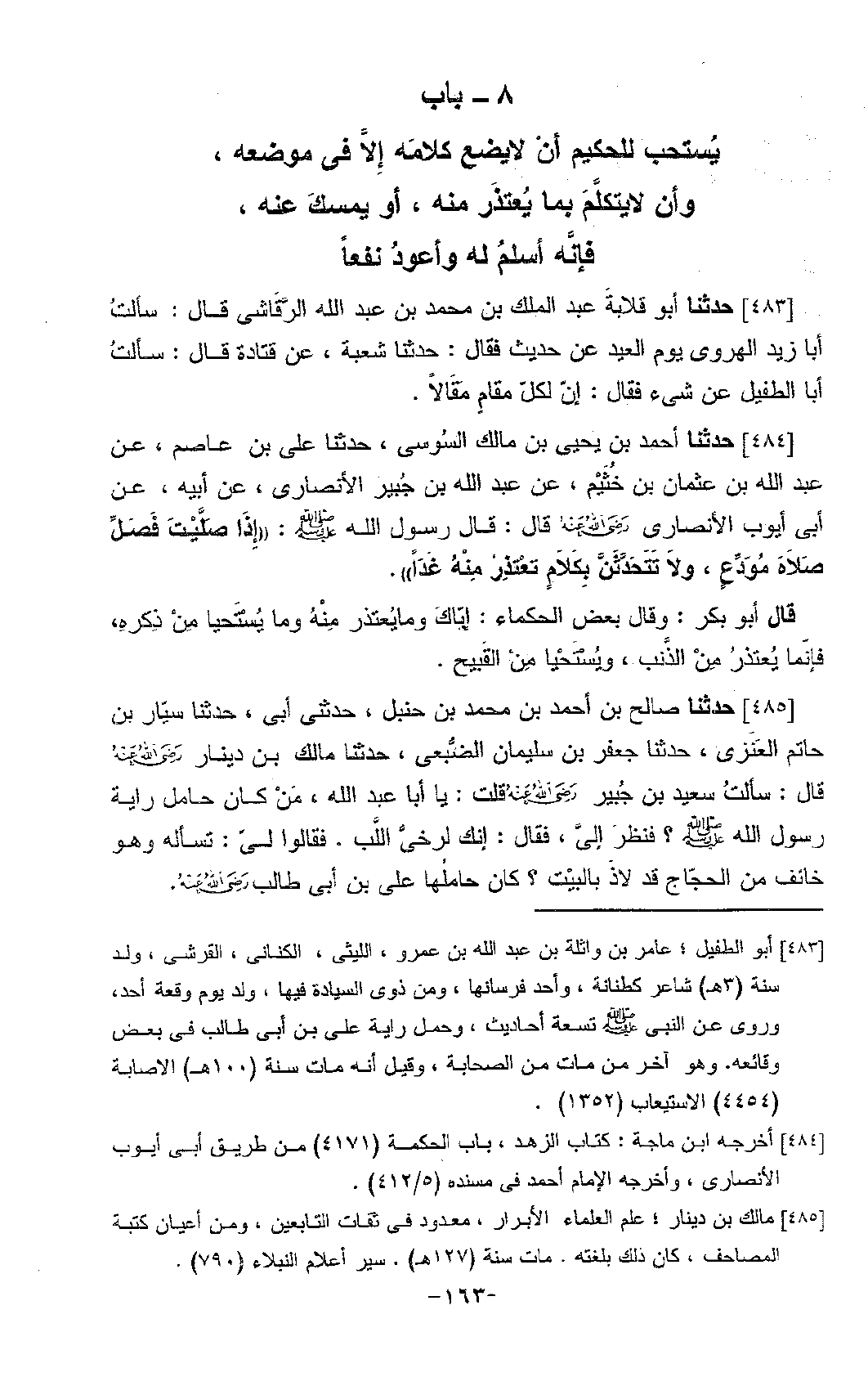 §بَابُ مَا يُسْتَحَبُّ لِلْحَكِيمِ أَنْ لَا يَضَعَ كَلَامَهُ إِلَّا فِي مَوْضِعِهِ، وَأَنْ لَا يَتَكَلَّمَ بِمَا يُعْتَذَرُ مِنْهُ، أَوْ يُمْسِكَ عَنْهُ، فَإِنَّهُ أَسْلَمُ لَهُ وَأَعْوَدُ نَفْعًا