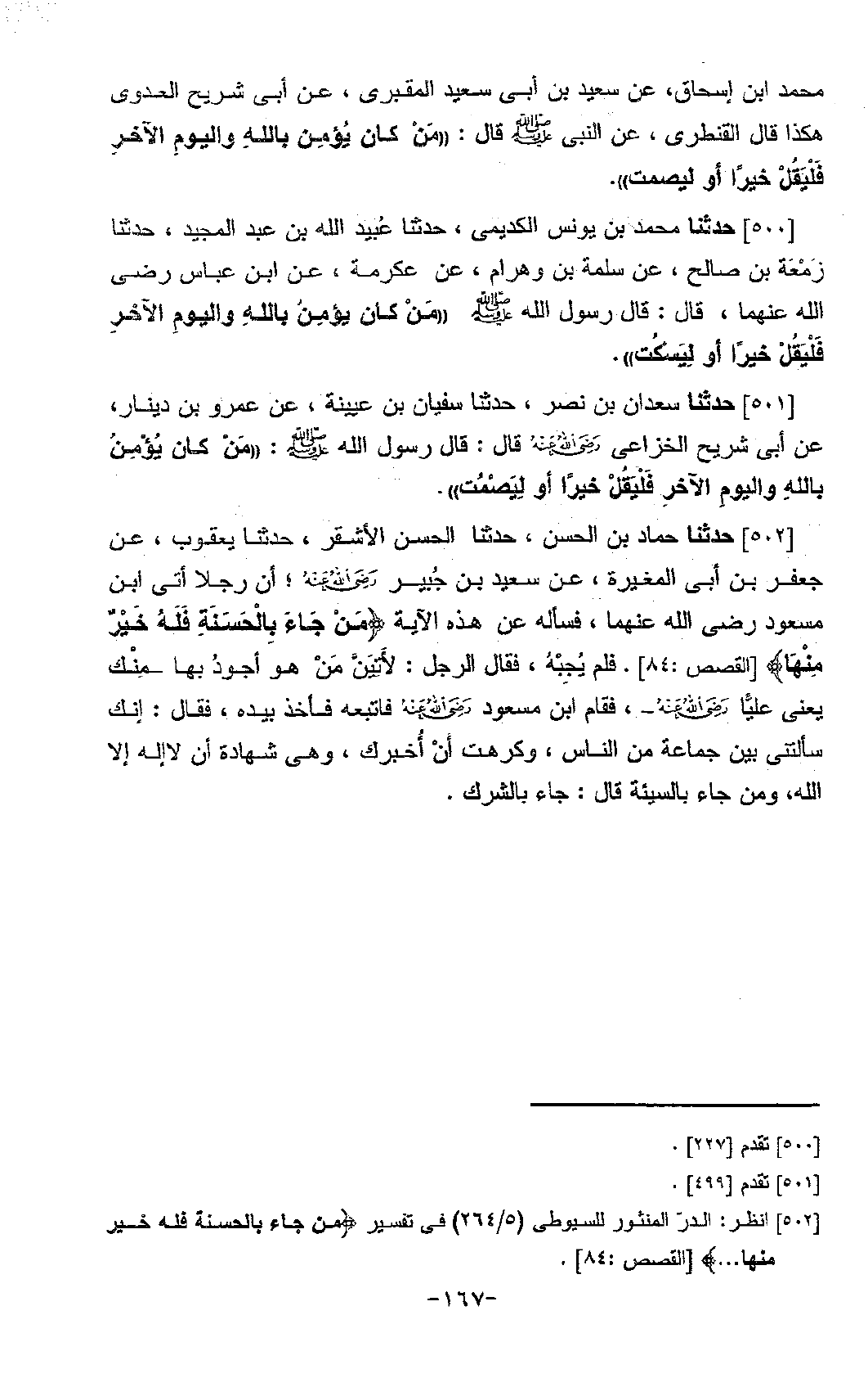 501 - حَدَّثَنَا سَعْدَانُ بْنُ نَصْرٍ، حَدَّثَنَا سُفْيَانُ بْنُ عُيَيْنَةَ، عَنْ عَمْرِو بْنِ دِينَارٍ، عَنْ أَبِي شُرَيْحٍ الْخُزَاعِيِّ، رَضِيَ اللَّهُ عَنْهُ قَالَ: قَالَ رَسُولُ اللَّهِ صَلَّى اللَّهُ عَلَيْهِ وَسَلَّمَ: «§مَنْ كَانَ يُؤْمِنُ بِاللَّهِ وَالْيَوْمِ الْآخِرِ فَلْيَقُلْ خَيْرًا أَوْ لِيَصْمُتْ»