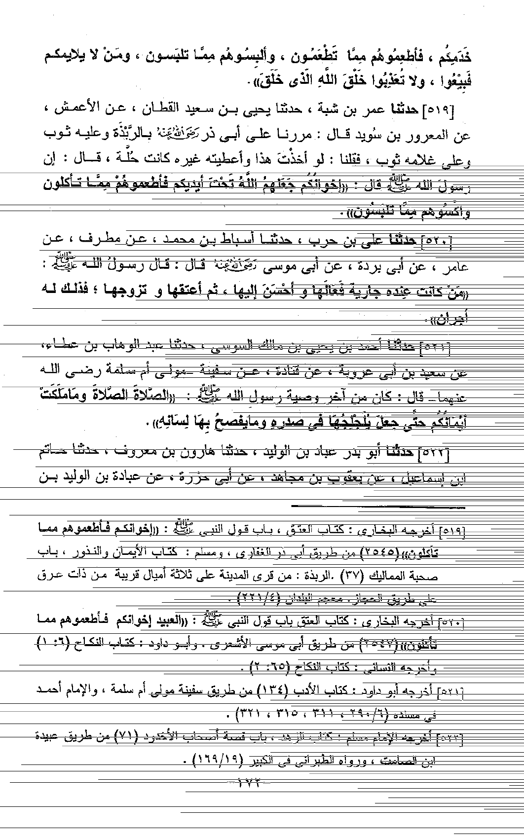 519 - حَدَّثَنَا عُمَرُ بْنُ شَبَّةَ، حَدَّثَنَا يَحْيَى بْنُ سَعِيدٍ الْقَطَّانُ، عَنِ الْأَعْمَشِ، عَنِ الْمَعْرُورِ بْنِ سُوَيْدٍ، قَالَ: مَرَرْنَا عَلَى أَبِي ذَرٍّ رَضِيَ اللَّهُ عَنْهُ بِالرَّبَذَةِ، وَعَلَيْهِ ثَوْبٌ، وَعَلَى غُلَامِهِ ثَوْبٌ، فَقُلْنَا: لَوْ أَخَذْتَ هَذَا، وَأَعْطَيْتَهُ غَيْرَهُ كَانَتْ حُلَّةً، قَالَ: إِنَّ رَسُولَ اللَّهِ صَلَّى اللَّهُ عَلَيْهِ وَسَلَّمَ قَالَ: «§إِخْوَانُكُمْ جَعَلَهُمُ اللَّهُ تَحْتَ أَيْدِيكُمْ، فَأَطْعِمُوهُمْ مِمَّا تَأْكُلُونَ، وَاكْسُوهُمْ مِمَّا تَلْبَسُونَ»