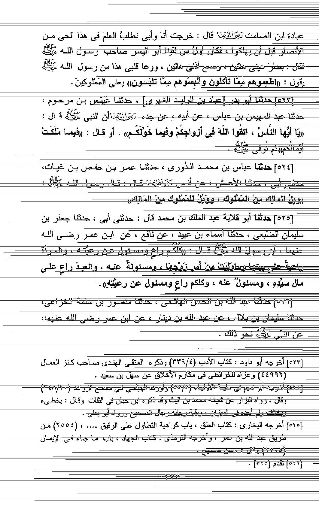 525 - حَدَّثَنَا أَبُو قِلَابَةَ عَبْدُ الْمَلِكِ بْنُ مُحَمَّدٍ، قَالَ: حَدَّثَنِي أَبِي، حَدَّثَنَا جَعْفَرُ بْنُ سُلَيْمَانَ الضُّبَعِيُّ، حَدَّثَنَا أَسْمَاءُ بْنُ عُبَيْدٍ، عَنْ نَافِعٍ، عَنِ ابْنِ عُمَرَ رَضِيَ اللَّهُ عَنْهُمَا أَنَّ رَسُولَ اللَّهِ صَلَّى اللَّهُ عَلَيْهِ وَسَلَّمَ قَالَ: «§كُلُّكُمْ رَاعٍ، وَمَسْئُولٌ عَنْ رَعِيَّتِهِ، وَالْمَرْأَةُ رَاعِيَةٌ عَلَى بَيْتِهَا وَمَا وَلِيَتْ مِنْ أَمْرِ زَوْجِهَا، وَمَسْئُولَةٌ عَنْهُ، وَالْعَبْدُ رَاعٍ عَلَى مَالِ سَيِّدِهِ، وَمَسْئُولٌ عَنْهُ، وَكُلُّكُمْ رَاعٍ، وَمَسْئُولٌ عَنْ رَعِيَّتِهِ»