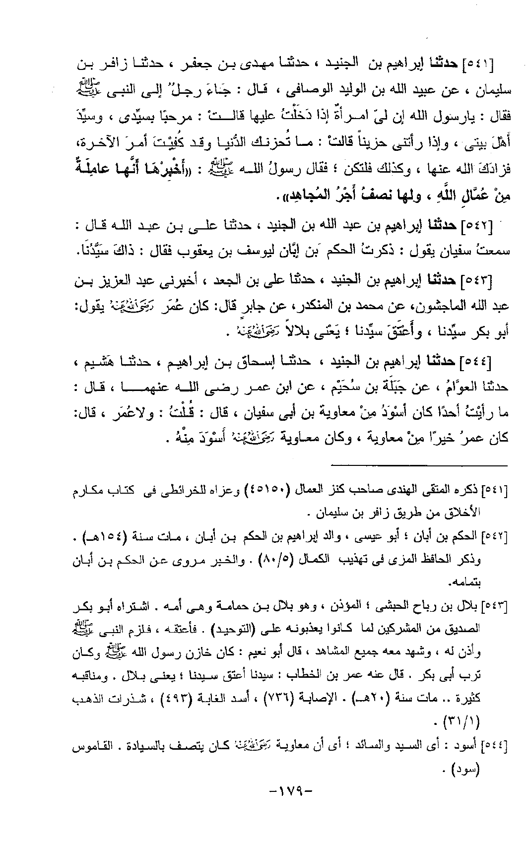 543 - حَدَّثَنَا إِبْرَاهِيمُ بْنُ الْجُنَيْدِ، حَدَّثَنَا عَلِيُّ بْنُ الْجَعْدِ، أَخْبَرَنِي عَبْدُ الْعَزِيزِ بْنُ عَبْدِ اللَّهِ الْمَاجِشُونُ، عَنْ مُحَمَّدِ بْنِ الْمُنْكَدِرِ، عَنْ جَابِرٍ، قَالَ: " كَانَ عُمَرُ رَضِيَ اللَّهُ عَنْهُ يَقُولُ: §أَبُو بَكْرٍ سَيِّدُنَا، وَأَعْتَقَ سَيِّدَنَا. يَعْنِي بِلَالًا رَضِيَ اللَّهُ عَنْهُ "