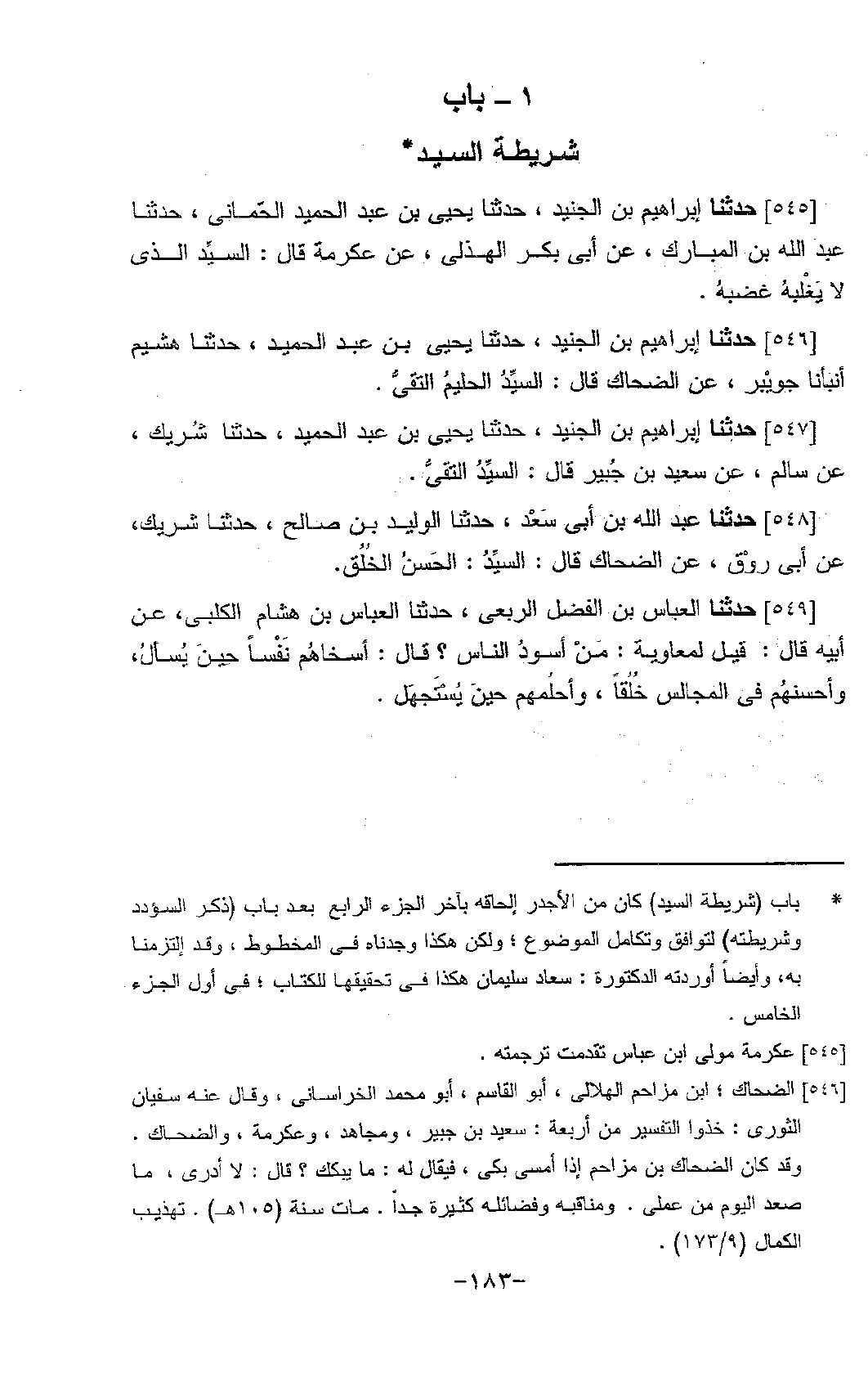546 - حَدَّثَنَا إِبْرَاهِيمُ بْنُ الْجُنَيْدِ، حَدَّثَنَا يَحْيَى بْنُ عَبْدِ الْحَمِيدِ، حَدَّثَنَا هُشَيْمٌ، أَنْبَأَنَا جُوَيْبِرٌ، عَنِ الضَّحَّاكِ، قَالَ: " §السَّيِّدُ: الْحَلِيمُ التَّقِيُّ "