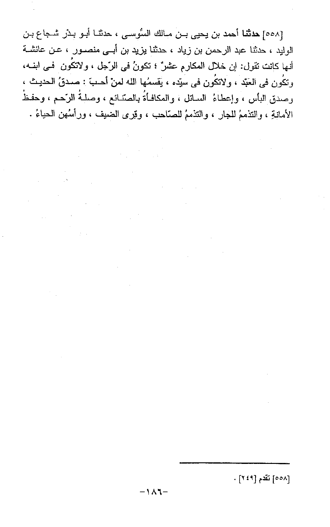 558 - حَدَّثَنَا أَحْمَدُ بْنُ يَحْيَى بْنِ مَالِكٍ السُّوسِيُّ، حَدَّثَنَا أَبُو بَدْرٍ شُجَاعُ بْنُ الْوَلِيدِ، حَدَّثَنَا عَبْدُ الرَّحْمَنِ بْنُ زِيَادٍ، حَدَّثَنَا يَزِيدُ بْنُ أَبِي مَنْصُورٍ، عَنْ عَائِشَةَ، أَنَّهَا كَانَتْ تَقُولُ: " إِنَّ §خِلَالَ الْمَكَارِمِ عَشْرٌ، تَكُونُ فِي الرَّجُلِ، وَلَا تَكُونُ فِي ابْنِهِ، وَتَكُونُ فِي الْعَبْدِ، وَلَا تَكُونُ فِي سَيِّدِهِ، يَقْسِمُهَا اللَّهُ لِمَنْ أَحَبَّ: صِدْقُ الْحَدِيثِ، وَصِدْقُ الْبَأْسِ، وَإِعْطَاءُ السَّائِلِ، وَالْمُكَافَأَةُ بِالصَّنَائِعِ، وَصِلَةُ الرَّحِمِ، وَحِفْظُ الْأَمَانَةِ، وَالتَّذَمُّمُ لِلْجَارِ، وَالتَّذَمُّمُ لِلصَّاحِبِ، وَقِرَى الضَّيْفِ، وَرَأْسُهُنَّ الْحَيَاءُ "