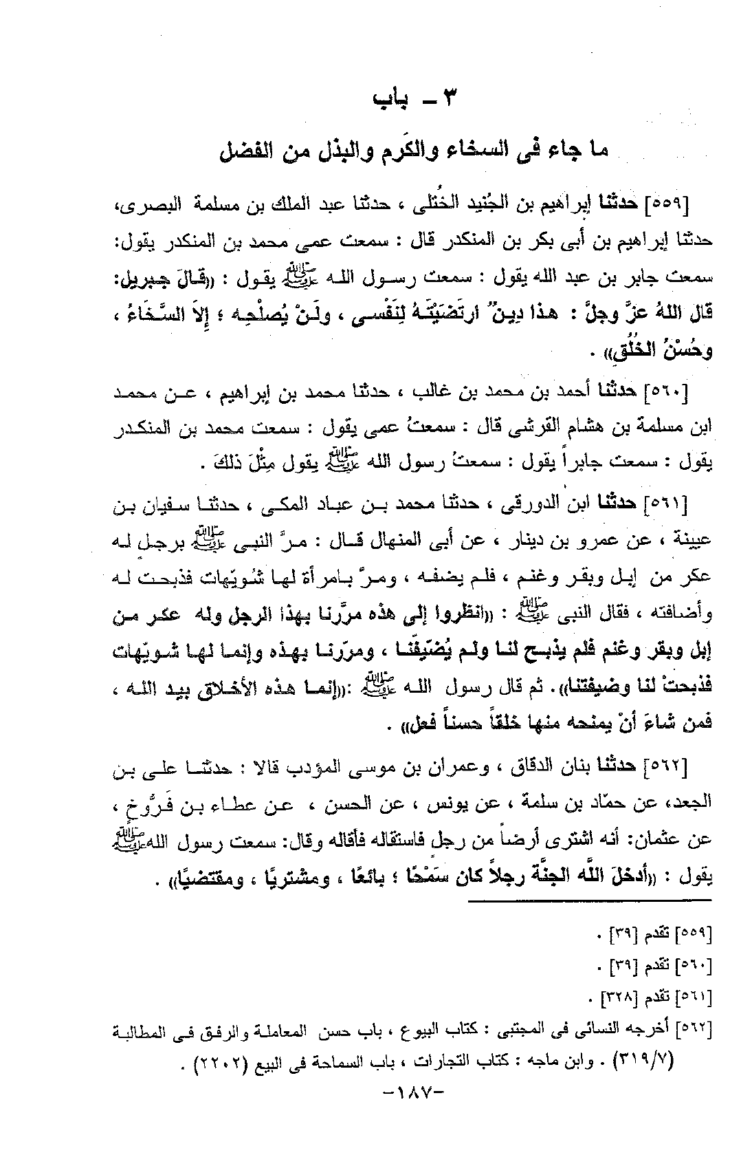 559 - حَدَّثَنَا إِبْرَاهِيمُ بْنُ الْجُنَيْدِ الْخُتُلِّيُّ، حَدَّثَنَا عَبْدُ الْمَلِكِ بْنُ مَسْلَمَةَ الْمِصْرِيُّ، حَدَّثَنَا إِبْرَاهِيمُ بْنُ أَبِي بَكْرِ بْنِ الْمُنْكَدِرِ، قَالَ: سَمِعْتُ عَمِّي، مُحَمَّدَ بْنَ الْمُنْكَدِرِ يَقُولُ: سَمِعْتُ جَابِرَ بْنَ عَبْدِ اللَّهِ، يَقُولُ: سَمِعْتُ رَسُولَ اللَّهِ صَلَّى اللَّهُ عَلَيْهِ وَسَلَّمَ يَقُولُ: قَالَ جِبْرِيلُ: قَالَ اللَّهُ عَزَّ وَجَلَّ: «§هَذَا دِينٌ ارْتَضَيْتُهُ لِنَفْسِي، وَلَنْ يُصْلِحَهُ إِلَّا السَّخَاءُ، وَحُسْنُ الْخُلُقِ»