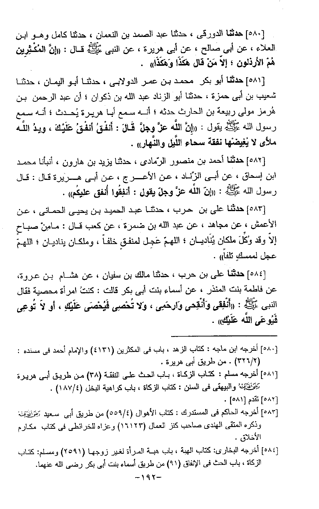 581 - حَدَّثَنَا أَبُو بَكْرٍ مُحَمَّدُ بْنُ عُمَرَ الدُّولَابِيُّ، حَدَّثَنَا أَبُو الْيَمَانِ، حَدَّثَنَا شُعَيْبُ بْنُ أَبِي حَمْزَةَ، حَدَّثَنَا أَبُو الزِّنَّادِ عَبْدُ اللَّهِ بْنُ ذَكْوَانَ، أَنَّ عَبْدَ الرَّحْمَنِ بْنَ هُرْمُزَ، مَوْلَى رَبِيعَةَ بْنِ الْحَارِثِ حَدَّثَهُ أَنَّهُ سَمِعَ أَبَا هُرَيْرَةَ، يُحَدِّثُ أَنَّهُ سَمِعَ رَسُولَ اللَّهِ صَلَّى اللَّهُ عَلَيْهِ وَسَلَّمَ يَقُولُ: " إِنَّ اللَّهَ عَزَّ وَجَلَّ قَالَ: §أَنْفِقْ أُنْفِقْ عَلَيْكَ، وَيَدُ اللَّهِ مَلْأَى، لَا يَغِيضُهَا نَفَقَةٌ، سَحَّاءُ اللَّيْلَ وَالنَّهَارَ "