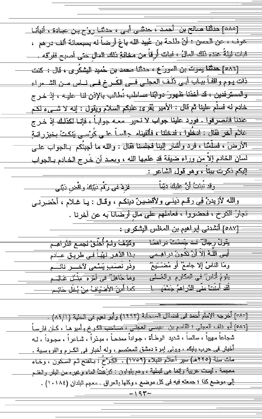 586 - حَدَّثَنَا يَمُوتُ بْنُ الْمُوَرِّعِ، حَدَّثَنَا مُحَمَّدُ بْنُ حُمَيْدٍ الْيَشْكُرِيُّ، قَالَ: " §كُنْتُ ذَاتَ يَوْمٍ وَاقِفًا بِبَابِ أَبِي دُلَفَ الْعِجْلِيِّ فِي الْكَرْخِ، فِي نَاسٍ مِنَ الشُّعَرَاءِ وَالْمُسْتَرْفِدِينَ، قَدْ أَخَذْنَا ظُهُورَ دَوَابِّنَا مَسَاطِبَ، نُطَالِبُ بِالْإِذْنِ لَنَا عَلَيْهِ، إِذْ خَرَجَ خَادِمٌ لَهُ، فَسَلَّمَ عَلَيْنَا، ثُمَّ قَالَ: الْأَمِيرُ يُقْرِئُ عَلَيْكُمُ السَّلَامَ، وَيَقُولُ: إِنَّهُ لَا شَيْءَ لَكُمْ عِنْدَنَا؛ فَانْصَرِفُوا فَوَرَدَ عَلَيْنَا جَوَابٌ لَا نَحِيرُ عَنْهُ جَوَابًا، فَإِنَّا لَكَذَلِكَ إِذْ خَرَجَ غُلَامٌ آخَرُ، فَقَالَ: ادْخُلُوا فَدَخَلْنَا، فَأَلْفَيْنَاهُ جَالِسًا عَلَى كُرْسِيٍّ، يَنْكُتُ بِخَيْزُرَانَةٍ الْأَرْضَ، فَسَلَّمْنَا، فَرَدَّ، وَأَشَارَ إِلَيْنَا، فَجَلَسْنَا، فَقَالَ: وَاللَّهِ مَا أَجَبْتُكُمْ بِالْجَوَابِ عَلَى لِسَانِ الْخَادِمِ إِلَّا مِنْ وَرَاءِ ضِيقَةٍ قَدْ عَلِمَهَا اللَّهُ، وَبَعْدَ أَنْ خَرَجَ الْخَادِمُ بِالْجَوَابِ إِلَيْكُمْ ذَكَرْتُ بَيْتًا، وَهُوَ قَوْلُ الشَّاعِرِ: