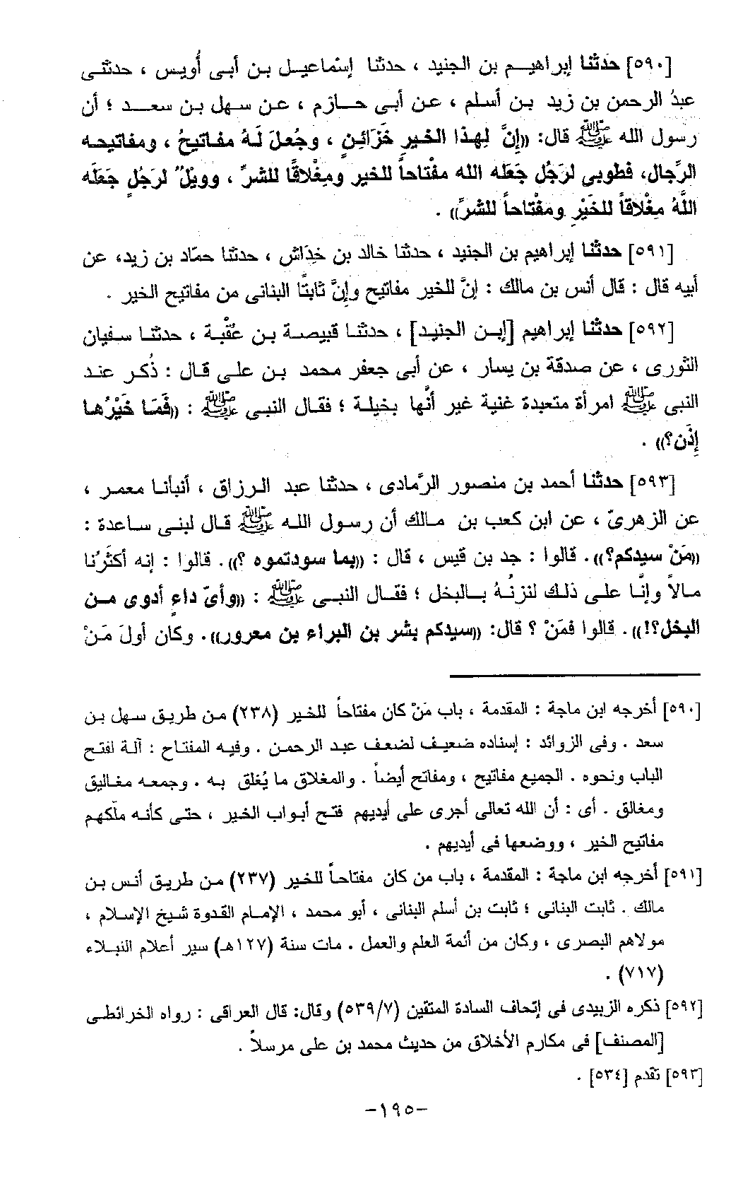 591 - حَدَّثَنَا إِبْرَاهِيمُ بْنُ الْجُنَيْدِ، حَدَّثَنَا خَالِدُ بْنُ خِدَاشٍ، حَدَّثَنَا حَمَّادُ بْنُ زَيْدٍ، عَنْ أَبِيهِ، قَالَ: قَالَ أَنَسُ بْنُ مَالِكٍ: «إِنَّ §لِلْخَيْرِ مَفَاتِيحَ، وَإِنَّ ثَابِتًا الْبُنَانِيَّ مِنْ مَفَاتِيحِ الْخَيْرِ»