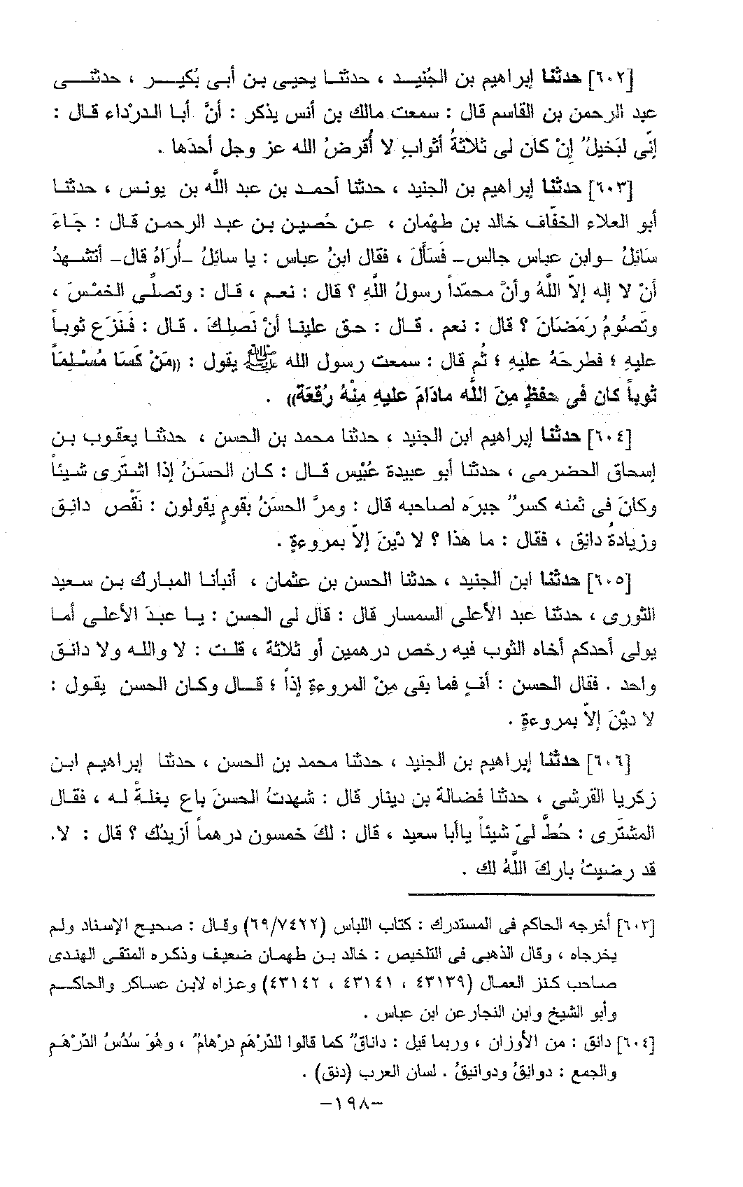 604 - حَدَّثَنَا إِبْرَاهِيمُ بْنُ الْجُنَيْدِ، حَدَّثَنَا مُحَمَّدُ بْنُ الْحَسَنِ، حَدَّثَنَا يَعْقُوبُ بْنُ إِسْحَاقَ الْحَضْرَمِيُّ، حَدَّثَنَا أَبُو عُبَيْدَةَ عُبَيْسٌ قَالَ: " كَانَ الْحَسَنُ §إِذَا اشْتَرَى شَيْئًا، وَكَانَ فِي ثَمَنِهِ كَسْرٌ جَبَرَهُ لِصَاحِبِهِ. قَالَ: وَمَرَّ الْحَسَنُ بِقَوْمٍ يَقُولُونَ: نَقْصُ دَانِقٍ، وَزِيَادَةُ دَانِقٍ فَقَالَ: مَا هَذَا؟ لَا دَيْنَ إِلَّا بِمُرُوءَةٍ "