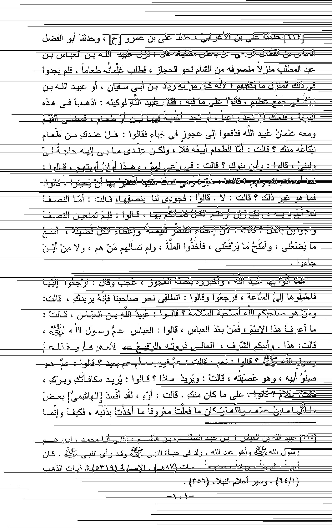 614 - حَدَّثَنَا عَلِيُّ بْنُ الْأَعْرَابِيِّ، حَدَّثَنَا عَلِيُّ بْنُ عَمْرٍو. ح وَحَدَّثَنَا أَبُو الْفَضْلِ الْعَبَّاسُ بْنُ الْفَضْلِ الرَّبَعِيُّ، عَنْ بَعْضِ مَشَايِخِهِ قَالَ: " نَزَلَ عُبَيْدُ اللَّهِ بْنُ الْعَبَّاسِ بْنِ عَبْدِ الْمُطَّلِبِ مَنْزِلًا مُنْصَرَفَهُ مِنَ الشَّامِ نَحْوَ الْحِجَازِ، فَطَلَبَ غِلْمَانُهُ طَعَامًا، فَلَمْ يَجِدُوا فِي ذَلِكَ الْمَنْزِلِ مَا يَكْفِيهِمْ؛ لِأَنَّهُ كَانَ مَرَّ بِهِ زِيَادُ بْنُ أَبِي سُفْيَانَ، أَوْ عُبَيْدُ اللَّهِ بْنُ زِيَادٍ فِي جَمْعٍ عَظِيمٍ، فَأَتَوْا عَلَى مَا فِيهِ، فَقَالَ عُبَيْدُ اللَّهِ لِوَكِيلِهِ: اذْهَبْ فِي هَذِهِ الْبَرِيَّةِ، فَعَلَّكَ أَنْ تَجِدَ رَاعِيًا، أَوْ تَجِدَ أَخْبِيَةً فِيهَا لَبَنٌ أَوْ طَعَامٌ فَمَضَى الْقَيِّمُ، وَمَعَهُ غِلْمَانُ عُبَيْدِ اللَّهِ، فَدَفَعُوا إِلَى عَجُوزٍ فِي خِبَاءٍ، فَقَالُوا: هَلْ عِنْدَكِ مِنْ طَعَامٍ نَبْتَاعَهُ مِنْكِ؟ قَالَتْ: أَمَّا الطَّعَامُ أَبِيعُهُ فَلَا، وَلَكِنْ عِنْدِي مَا بِي إِلَيْهِ حَاجَةٌ لِي وَلِبَنِيِّ قَالُوا: وَأَيْنَ بَنُوكِ؟ قَالَتْ: فِي رَعْيٍ لَهُمْ، وَهَذَا أَوَانُ أَوْبَتِهِمْ قَالُوا: فَمَا أَعْدَدْتِ لَكِ وَلَهُمْ؟ قَالَتْ: خُبْزَةً، وَهِيَ تَحْتَ مَلَّتِهَا أَنْتَظِرُ بِهَا أَنْ يَجِيئُوا قَالُوا: فَمَا هُوَ غَيْرُ ذَلِكَ؟ قَالَتْ: لَا قَالُوا: فَجُودِي لَنَا بِنِصْفِهَا قَالَتْ: أَمَّا النِّصْفُ فَلَا أَجُودُ بِهِ، وَلَكِنْ إِنْ أَرَدْتُمُ الْكُلَّ فَشَأْنُكُمْ بِهَا قَالُوا: فَلِمَ تَمْنَعِينَ النِّصْفَ، وَتَجُودِينَ بِالْكُلِّ؟ قَالَتْ: لِأَنَّ §إِعْطَاءَ الشَّطْرِ نَقِيصَةٌ، وَإِعْطَاءَ الْكُلِّ فَضِيلَةٌ، أَمْنَعُ مَا يَضَعُنِي، وَأَمْنَحُ مَا يَرْفَعُنِي فَأَخَذُوا الْمَلَّةَ، وَلَمْ تَسْأَلْهُمْ مَنْ هُمْ، وَلَا مِنْ أَيْنَ جَاءُوا، فَلَمَّا أَتَوْا بِهَا عُبَيْدَ اللَّهِ، وَأَخْبَرُوهُ بِقِصَّةِ الْعَجُوزِ، عَجِبَ، وَقَالَ: ارْجِعُوا إِلَيْهَا، فَاحْمِلَوهَا إِلَيَّ السَّاعَةَ فَرَجَعُوا وَقَالُوا: انْطَلِقِي نَحْوَ صَاحِبِنَا؛ فَإِنَّهُ يُرِيدُكِ قَالَتْ: وَمَنْ هُوَ صَاحِبُكُمُ، اللَّهُ أَصْحَبَهُ السَّلَامَةَ؟ قَالُوا: عُبَيْدُ اللَّهِ بْنُ الْعَبَّاسِ قَالَتْ: مَا أَعْرِفُ هَذَا الِاسْمَ، فَمَنْ بَعْدَ الْعَبَّاسِ؟ قَالُوا: الْعَبَّاسُ عَمُّ رَسُولِ اللَّهِ صَلَّى اللَّهُ عَلَيْهِ وَسَلَّمَ قَالَتْ: هَذَا وَأَبِيكُمُ الشَّرَفُ الْعَالِي ذِرْوَتُهُ، الرَّفِيعُ عِمَادُهُ، هِيهِ، أَبُو هَذَا عَمُّ رَسُولِ اللَّهِ صَلَّى اللَّهُ عَلَيْهِ وَسَلَّمَ؟ قَالُوا: نَعَمْ قَالَتْ: عَمٌّ قَرِيبٌ، أَمْ عَمٌّ بَعِيدٌ؟ قَالُوا: عَمٌّ هُوَ صِنْوُ أَبِيهِ، وَهُوَ عَصَبَتُهُ قَالَتْ: وَيُرِيدُ مَاذَا؟ قَالُوا: يُرِيدُ مُكَافَأَتَكِ وَبِرَّكَ قَالَتْ: عَلَامَ؟ قَالُوا: عَلَى مَا كَانَ مِنْكِ قَالَتْ: أَوْهِ، لَقَدْ أَفْسَدَ الْهَاشِمِيُّ بَعْضَ مَا أَثَّلَ لَهُ ابْنُ عَمِّهِ، وَاللَّهِ لَوْ كَانَ مَا فَعَلْتُ مَعْرُوفًا مَا أَخَذْتُ بِذَنَبِهِ، فَكَيْفَ وَإِنَّمَا -[202]- هُوَ شَيْءٌ يَجِبُ عَلَى الْخَلْقِ أَنْ يُشَارِكَ بَعْضُهُمْ فِيهِ بَعْضًا؟ قَالُوا: فَانْطَلِقِي؛ فَإِنَّهُ يُحِبُّ أَنْ يَرَاكِ قَالَتْ: قَدْ تَقَدَّمَ مِنْكُمْ وَعِيدٌ، مَا أَجِدُ نَفْسِي تَسْخُو بِالْحَرَكَةِ مَعَهُ قَالُوا: فَأَنْتِ بِالْخِيَارِ إِنْ بُذِلَ لَكِ شَيْءٌ بَيْنَ أَخْذِهِ وَتَرَكِهِ قَالَتْ: لَا حَاجَةَ لِي بِشَيْءٍ مِنْ هَذَا إِذْ كَانَ هَذَا أَوَّلَهُ قَالُوا: فَلَا بُدَّ مِنْ أَنْ تَنْطَلِقِي إِلَيْهِ قَالَتْ: فَإِنِّي مَا أَنْهَضُ عَلَى كُرْهٍ إِلَّا لِوَاحِدَةٍ قَالُوا: وَمَا هِيَ؟ قَالَتْ: أَرَى وَجْهًا هُوَ جَنَاحُ رَسُولِ اللَّهِ صَلَّى الل