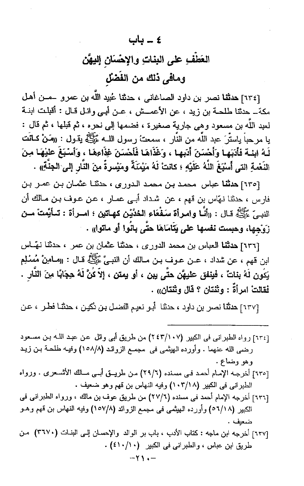 637 - حَدَّثَنَا نَصْرُ بْنُ دَاوُدَ، حَدَّثَنَا أَبُو نُعَيْمٍ الْفَضْلُ بْنُ دُكَيْنٍ، حَدَّثَنَا فِطْرٌ، عَنْ -[211]- شُرَحْبِيلَ بْنِ مُسْلِمٍ، قَالَ: سَمِعْتُ ابْنَ عَبَّاسٍ، يَقُولُ: قَالَ رَسُولُ اللَّهِ صَلَّى اللَّهُ عَلَيْهِ وَسَلَّمَ: «§مَا مِنْ مُسْلِمٍ يُدْرِكُ لَهُ ابْنَتَانِ، فَيُحْسِنُ إِلَيْهِمَا مَا صَحِبَتَاهُ أَوْ صَحِبَهُمَا، إِلَّا أَدْخَلَتَاهُ الْجَنَّةَ»