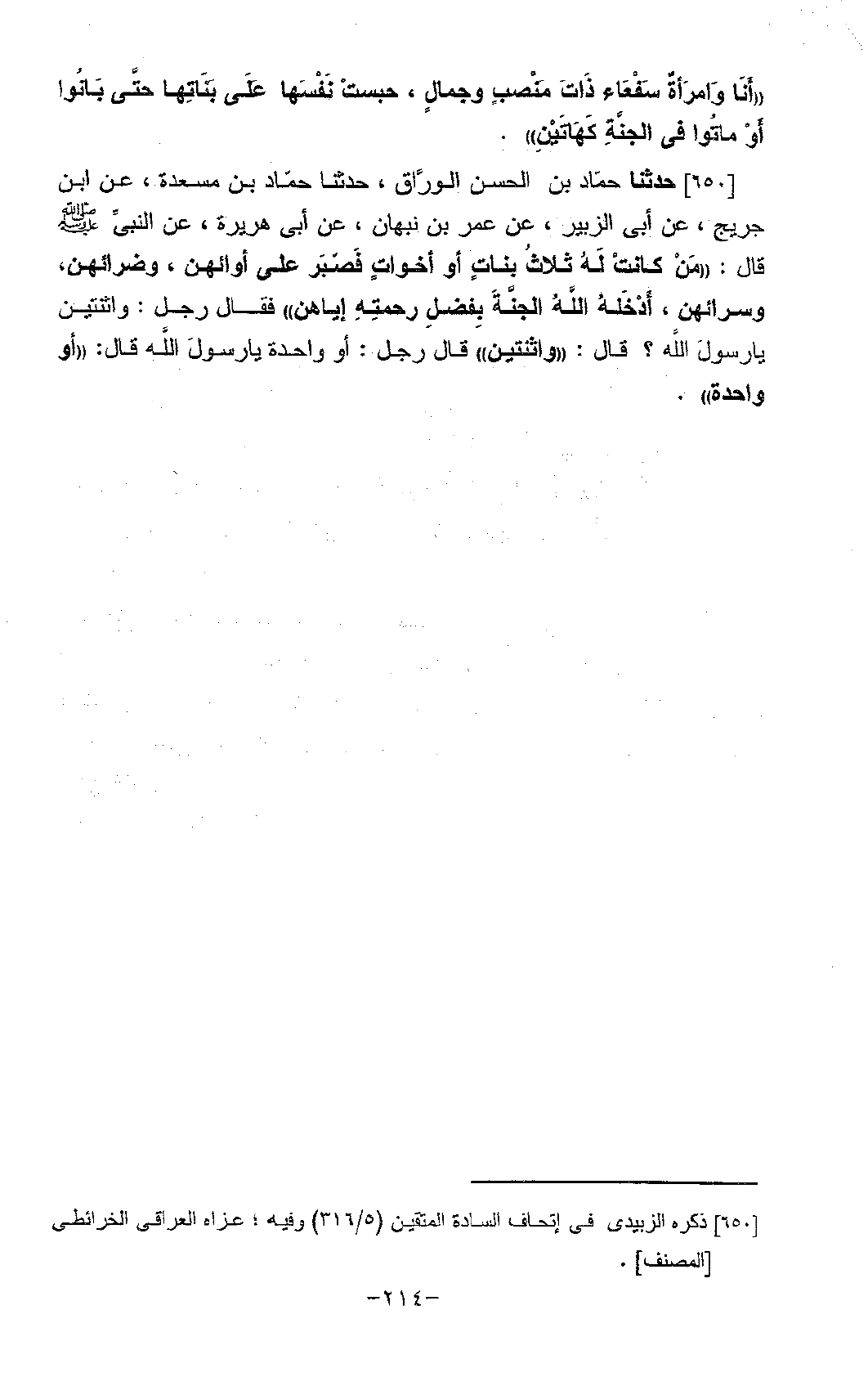 650 - حَدَّثَنَا حَمَّادُ بْنُ الْحَسَنِ الْوَرَّاقُ، حَدَّثَنَا حَمَّادُ بْنُ مَسْعَدَةَ، عَنِ ابْنِ جُرَيْجٍ، عَنْ أَبِي الزُّبَيْرِ، عَنْ عُمَرَ بْنِ نَبْهَانَ، عَنْ أَبِي هُرَيْرَةَ، عَنِ النَّبِيِّ صَلَّى اللَّهُ عَلَيْهِ وَسَلَّمَ قَالَ: §مَنْ كَانَتْ لَهُ ثَلَاثُ بَنَاتٍ أَوْ أَخَوَاتٍ، فَصَبَرَ عَلَى أَوَائِهِنَّ، وَضَرَّائِهِنَّ، وَسَرَّائِهِنَّ، أَدْخَلَهُ اللَّهُ الْجَنَّةَ؛ بِفَضْلِ رَحْمَتِهِ إِيَّاهُنَّ فَقَالَ رَجُلٌ: وَاثْنَتَيْنِ يَا رَسُولَ اللَّهِ؟ قَالَ: وَاثْنَتَيْنِ قَالَ رَجُلٌ: أَوْ وَاحِدَةٍ يَا رَسُولَ اللَّهِ؟ قَالَ: أَوْ وَاحِدَةٍ "