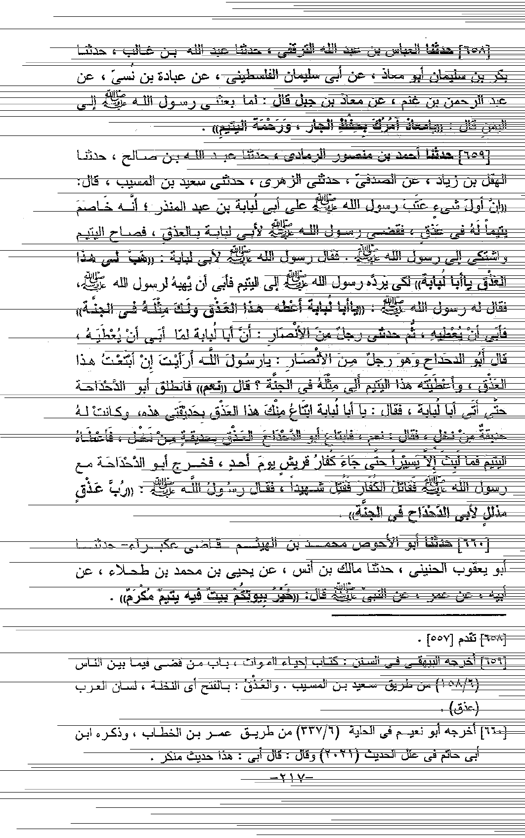 660 - حَدَّثَنَا أَبُو الْأَحْوَصِ مُحَمَّدُ بْنُ الْهَيْثَمِ قَاضِي عُكْبَرَاءَ، حَدَّثَنَا أَبُو يَعْقُوبَ الْحُنَيْنِيُّ، حَدَّثَنَا مَالِكُ بْنُ أَنَسٍ، عَنْ يَحْيَى بْنِ مُحَمَّدِ بْنِ طَحْلَاءَ، عَنْ أَبِيهِ، عَنْ عُمَرَ، عَنِ النَّبِيِّ صَلَّى اللَّهُ عَلَيْهِ وَسَلَّمَ قَالَ: «§خَيْرُ بُيُوتِكُمْ بَيْتٌ فِيهِ يَتِيمٌ مُكْرَمٌ»