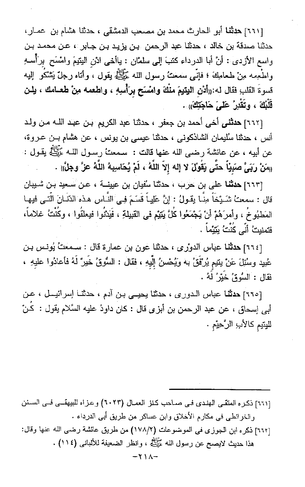 661 - حَدَّثَنَا أَبُو الْحَارِثِ مُحَمَّدُ بْنُ مُصْعَبٍ الدِّمَشْقِيُّ، حَدَّثَنَا هِشَامُ بْنُ عَمَّارٍ، حَدَّثَنَا صَدَقَةُ بْنُ خَالِدٍ، حَدَّثَنَا عَبْدُ الرَّحْمَنِ بْنُ يَزِيدَ بْنِ جَابِرٍ، عَنْ مُحَمَّدِ بْنِ وَاسِعٍ الْأَزْدِيِّ، أَنَّ أَبَا الدَّرْدَاءِ، كَتَبَ إِلَى سَلْمَانَ: يَا أَخِي، " §أَدْنِ الْيَتِيمَ، وَامْسَحْ بِرَأْسِهِ، وَأَطْعِمْهُ مِنْ طَعَامِكَ؛ فَإِنِّي سَمِعْتُ رَسُولَ اللَّهِ صَلَّى اللَّهُ عَلَيْهِ وَسَلَّمَ يَقُولُ، وَأَتَاهُ رَجُلٌ يَشْكُو إِلَيْهِ قَسْوَةَ الْقَلْبِ، فَقَالَ لَهُ: أَدْنِ الْيَتِيمَ مِنْكَ، وَامْسَحْ بِرَأْسِهِ، وَأَطْعِمْهُ مِنْ طَعَامِكَ؛ يَلِنْ قَلْبُكَ، وَتَقْدِرْ عَلَى حَاجَتِكَ "