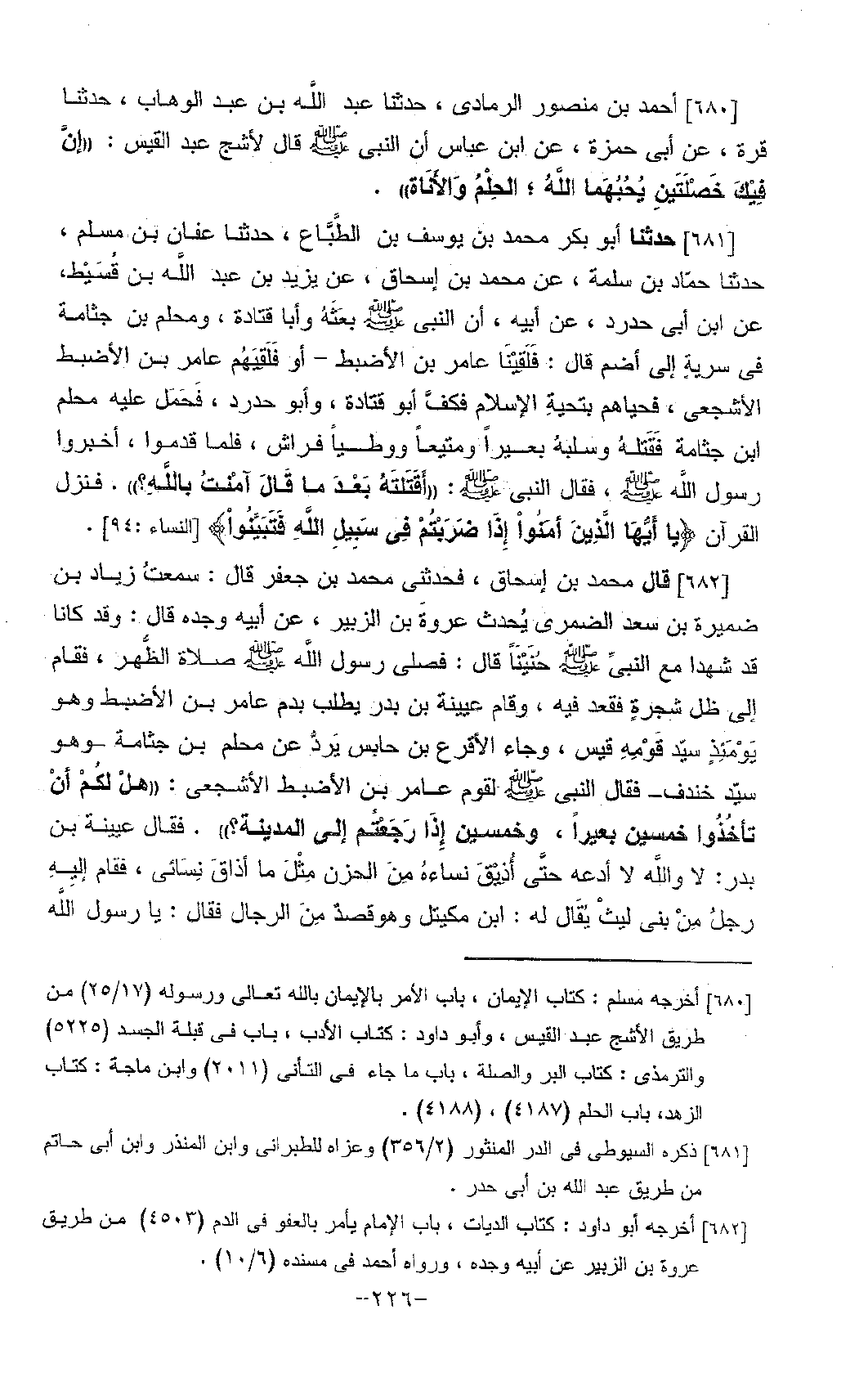 681 - حَدَّثَنَا أَبُو بَكْرٍ مُحَمَّدُ بْنُ يُوسُفَ بْنِ الطَّبَّاعِ، حَدَّثَنَا عَفَّانُ بْنُ مُسْلِمٍ، حَدَّثَنَا حَمَّادُ بْنُ سَلَمَةَ، عَنْ مُحَمَّدِ بْنِ إِسْحَاقَ، عَنْ يَزِيدَ بْنِ عَبْدِ اللَّهِ بْنِ قُسَيْطٍ، عَنِ ابْنِ أَبِي حَدْرَدٍ، عَنْ أَبِيهِ، " §أَنَّ النَّبِيَّ صَلَّى اللَّهُ عَلَيْهِ وَسَلَّمَ بَعَثَهُ وَأَبَا قَتَادَةَ، وَمُحَلِّمَ بْنَ جَثَّامَةَ فِي سَرِيَّةٍ إِلَى إِضَمٍ قَالَ: فَلَقِيَنَا عَامِرَ بْنَ الْأَضْبَطِ أَوْ فَلَقِيَهُمْ عَامِرُ بْنُ الْأَضْبَطِ الْأَشْجَعِيُّ فَحَيَّاهُمْ بِتَحِيَّةِ الْإِسْلَامِ، فَكَفَّ أَبُو قَتَادَةَ، وَأَبُو حَدْرَدٍ، فَحَمَلَ عَلَيْهِ مُحَلِّمُ بْنُ جَثَّامَةَ، فَقَتَلَهُ، وَسَلَبَهُ بَعِيرًا وَمَتِيعًا وَوَطِيَا فِرَاشٍ، فَلَمَّا قَدِمُوا، أَخْبَرُوا رَسُولَ اللَّهِ صَلَّى اللَّهُ عَلَيْهِ وَسَلَّمَ، فَقَالَ النَّبِيُّ صَلَّى اللَّهُ عَلَيْهِ وَسَلَّمَ: أَقَتَلْتَهُ بَعْدَ مَا قَالَ آمَنْتُ بِاللَّهِ؟ فَنَزَلَ الْقُرْآنُ: {يَا أَيُّهَا الَّذِينَ آمَنُوا إِذَا ضَرَبْتُمْ فِي سَبِيلِ اللَّهِ فَتَبَيَّنُوا} [النساء: 94]