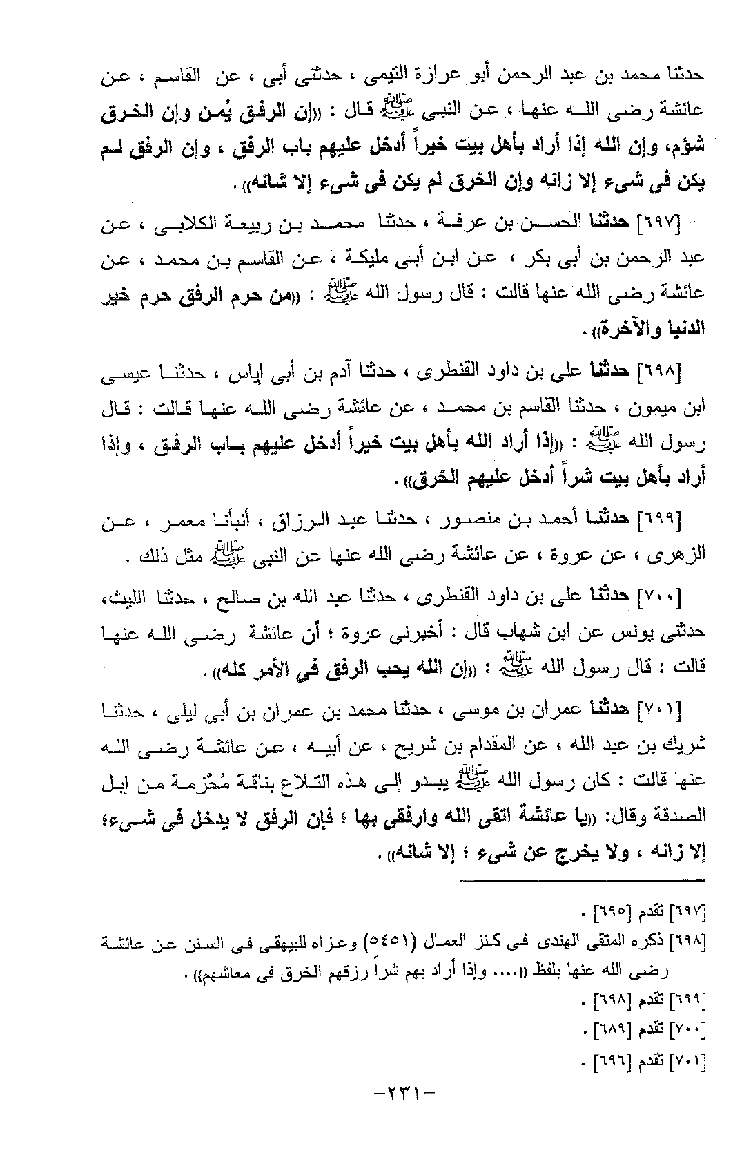 697 - حَدَّثَنَا الْحَسَنُ بْنُ عَرَفَةَ، حَدَّثَنَا مُحَمَّدُ بْنُ رَبِيعَةَ الْكِلَابِيُّ، عَنْ عَبْدِ الرَّحْمَنِ بْنِ أَبِي بَكْرٍ، عَنِ ابْنِ أَبِي مُلَيْكَةَ، عَنِ الْقَاسِمِ بْنِ مُحَمَّدٍ، عَنْ عَائِشَةَ، رَضِيَ اللَّهُ عَنْهَا قَالَتْ: قَالَ رَسُولُ اللَّهِ صَلَّى اللَّهُ عَلَيْهِ وَسَلَّمَ: «§مَنْ حُرِمَ الرِّفْقَ حُرِمَ خَيْرَ الدُّنْيَا وَالْآخِرَةِ»