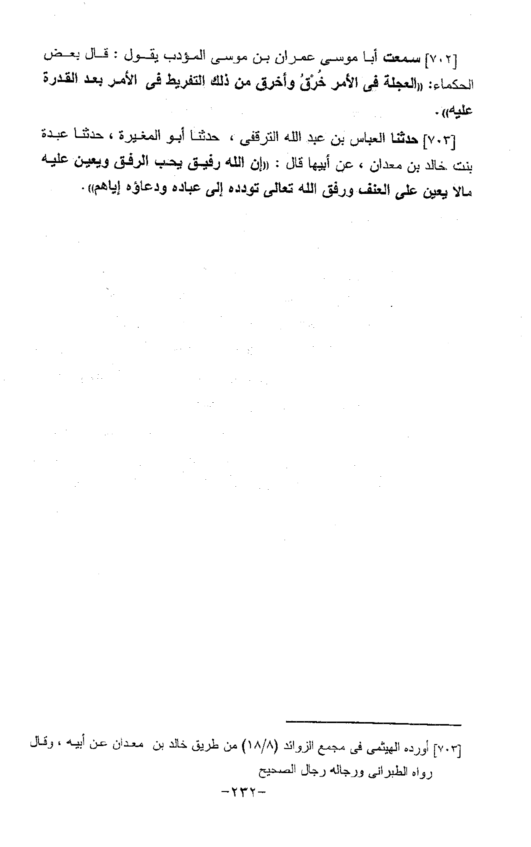 703 - حَدَّثَنَا الْعَبَّاسُ بْنُ عَبْدِ اللَّهِ التَّرْقُفِيُّ، حَدَّثَنَا أَبُو الْمُغِيرَةِ، حَدَّثَنَا عَبْدَةُ بِنْتُ خَالِدِ بْنِ مَعْدَانَ، عَنْ أَبِيهَا، قَالَ: «إِنَّ §اللَّهَ رَفِيقٌ، يُحِبُّ الرِّفْقَ، وَيُعِينُ عَلَيْهِ مَا لَا يُعِينُ عَلَى الْعُنْفِ، وَرِفْقُ اللَّهِ تَعَالَى تَوَدُّدُهُ إِلَى عِبَادِهِ، وَدُعَاؤُهُ إِيَّاهُمْ»
