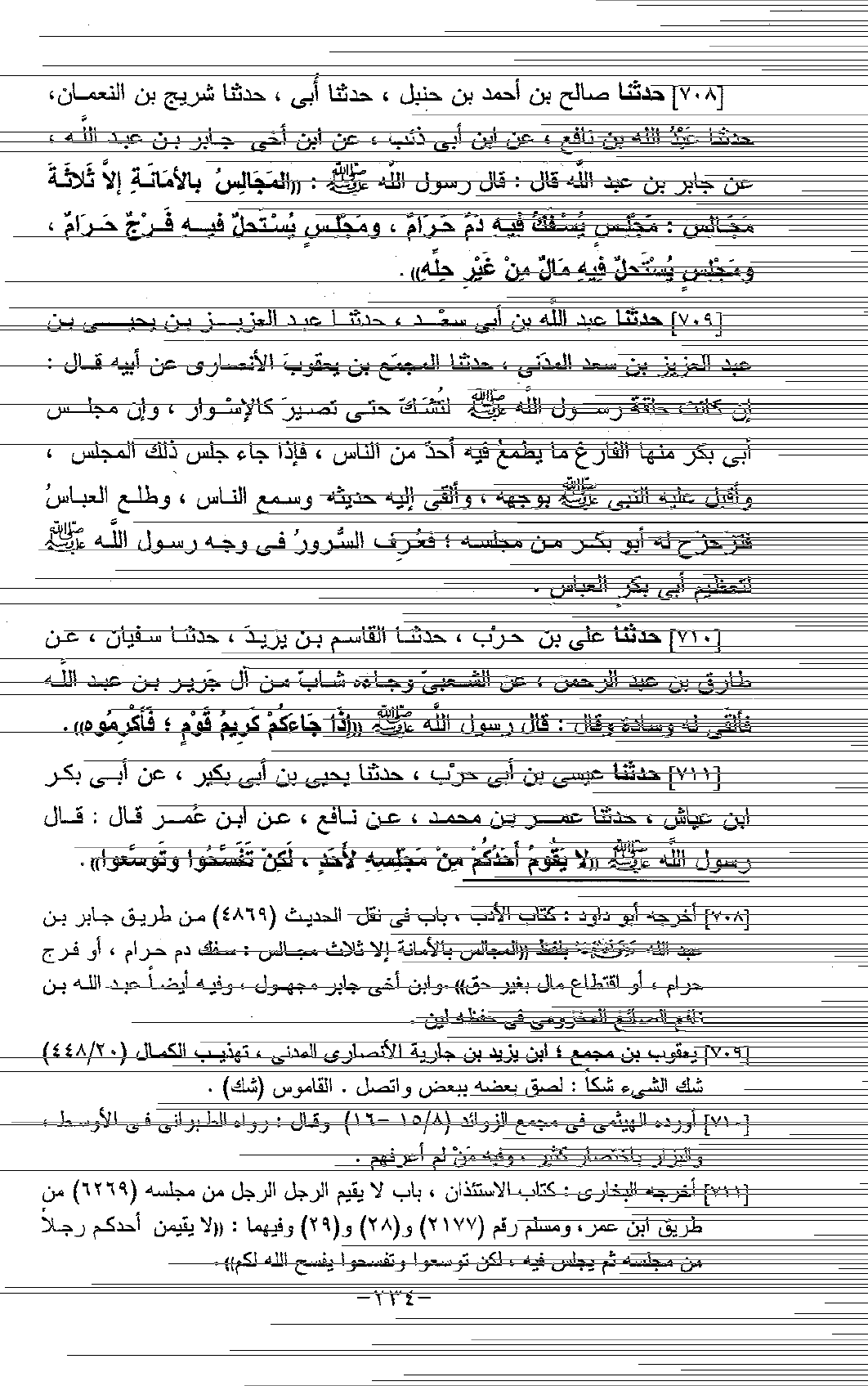 708 - حَدَّثَنَا صَالِحُ بْنُ أَحْمَدَ بْنِ حَنْبَلٍ، حَدَّثَنَا أَبِي، حَدَّثَنَا سُرَيْجُ بْنُ النُّعْمَانِ، حَدَّثَنَا عَبْدُ اللَّهِ بْنُ نَافِعٍ، عَنِ ابْنِ أَبِي ذِئْبٍ، عَنِ ابْنِ أَخِي جَابِرِ بْنِ عَبْدِ اللَّهِ، عَنْ جَابِرِ بْنِ عَبْدِ اللَّهِ، قَالَ: قَالَ رَسُولُ اللَّهِ صَلَّى اللَّهُ عَلَيْهِ وَسَلَّمَ: " §الْمَجَالِسُ بِالْأَمَانَةِ إِلَّا ثَلَاثَةَ مَجَالِسَ: مَجْلِسٌ يُسْفَكُ فِيهِ دَمٌ حَرَامٌ، وَمَجْلِسٌ يُسْتَحَلُّ فِيهِ فَرْجٌ حَرَامٌ، وَمَجْلِسٌ يُسْتَحَلُّ فِيهِ مَالٌ مِنْ غَيْرِ حِلِّهِ "