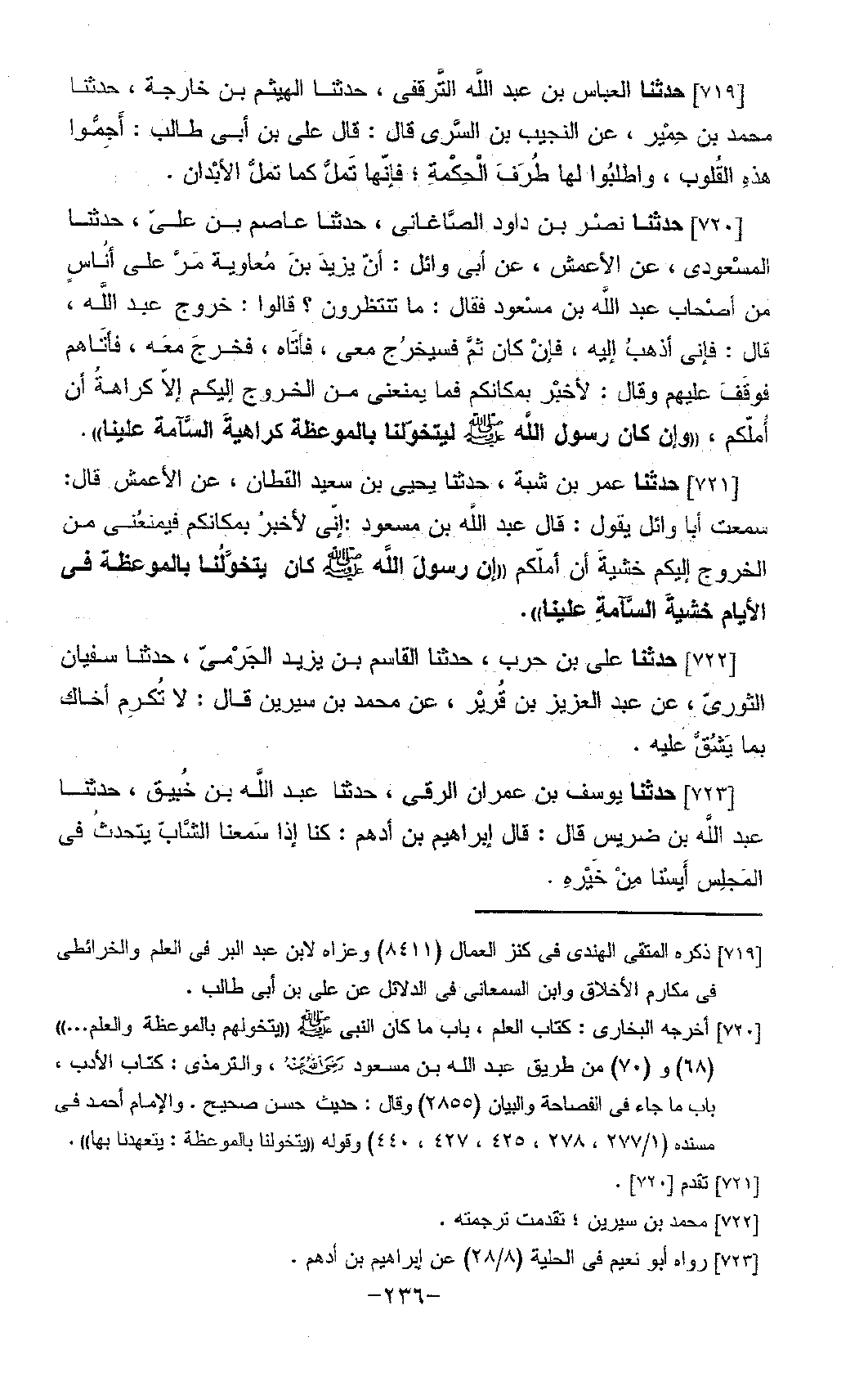721 - حَدَّثَنَا عُمَرُ بْنُ شَبَّةَ، حَدَّثَنَا يَحْيَى بْنُ سَعِيدٍ الْقَطَّانُ، عَنِ الْأَعْمَشِ، قَالَ: سَمِعْتُ أَبَا وَائِلٍ، يَقُولُ: قَالَ عَبْدُ اللَّهِ بْنِ مَسْعُودٍ: «§إِنِّي لَأُخْبَرُ بِمَكَانِكُمْ، فَيَمْنَعُنِي مِنَ الْخُرُوجِ إِلَيْكُمْ خَشْيَةُ أَنْ أُمِلَّكُمْ، إِنَّ رَسُولَ اللَّهِ صَلَّى اللَّهُ عَلَيْهِ وَسَلَّمَ كَانَ يَتَخَوَّلُنَا بِالْمَوْعِظَةِ فِي الْأَيَّامِ خَشْيَةَ السَّآمَةِ عَلَيْنَا»
