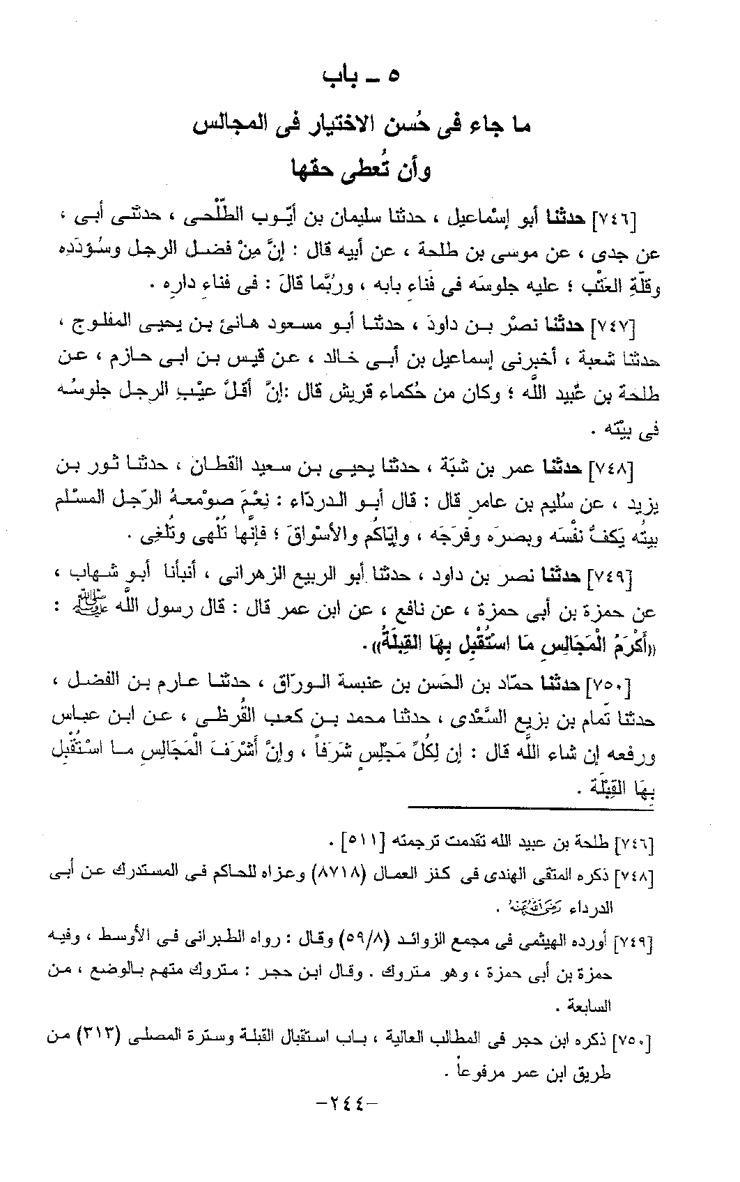 746 - حَدَّثَنَا أَبُو إِسْمَاعِيلَ، حَدَّثَنَا سُلَيْمَانُ بْنُ أَيُّوبَ الطَّلْحِيُّ، حَدَّثَنِي أَبِي، عَنْ جَدِّي، عَنْ مُوسَى بْنِ طَلْحَةَ، عَنْ أَبِيهِ، قَالَ: " إِنَّ §مِنْ فَضْلِ الرَّجُلِ وَسُؤْدَدِهِ، وَقِلَّةِ الْعَتْبِ عَلَيْهِ، جُلُوسَهُ فِي فِنَاءِ بَابِهِ وَرُبَّمَا قَالَ: فِي فِنَاءِ دَارِهِ "
