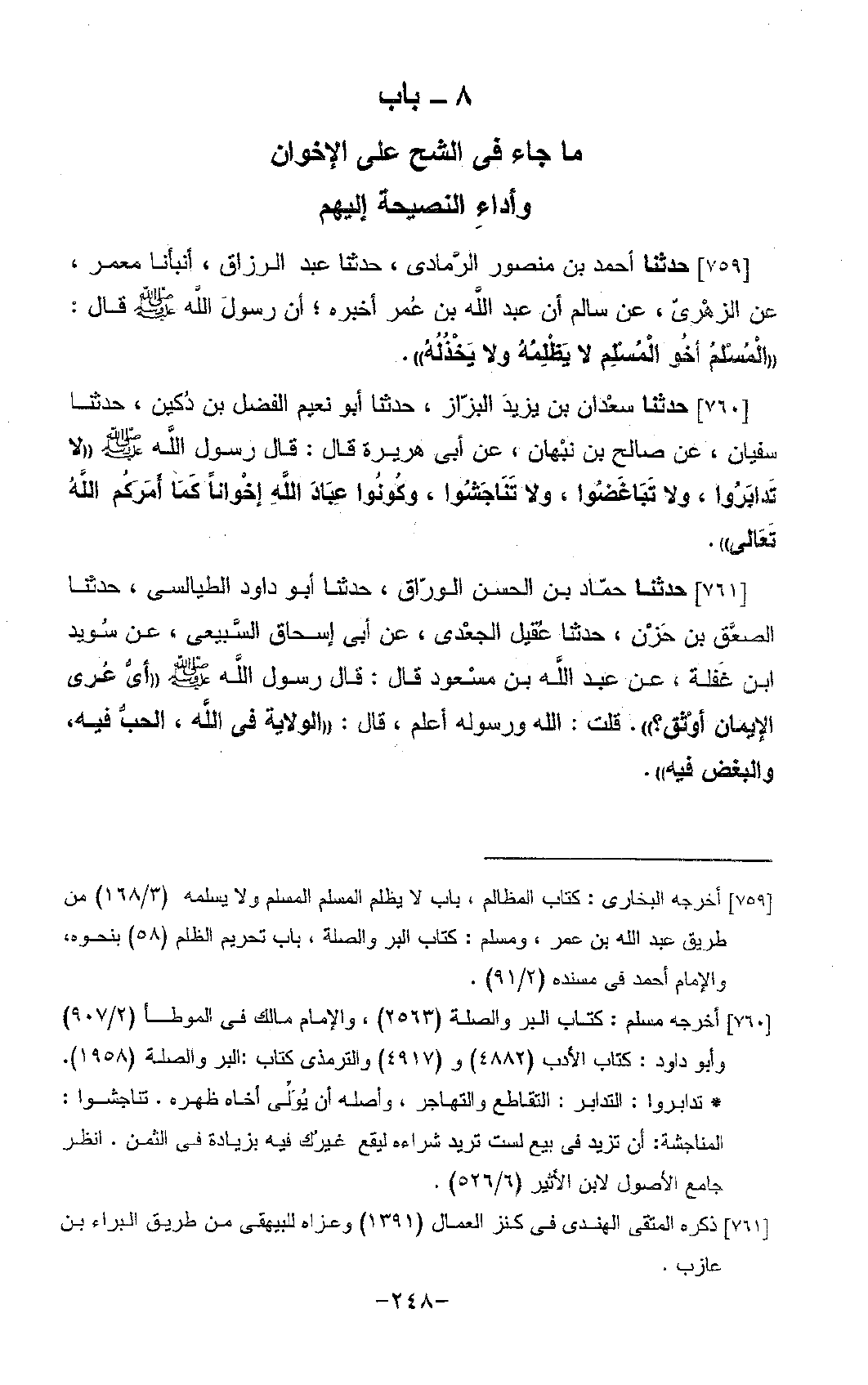 760 - حَدَّثَنَا سَعْدَانُ بْنُ يَزِيدَ الْبَزَّارُ، حَدَّثَنَا أَبُو نُعَيْمٍ الْفَضْلُ بْنُ دُكَيْنٍ، حَدَّثَنَا سُفْيَانُ، عَنْ صَالِحِ بْنِ نَبْهَانَ، عَنْ أَبِي هُرَيْرَةَ، قَالَ: قَالَ رَسُولُ اللَّهِ صَلَّى اللَّهُ عَلَيْهِ وَسَلَّمَ: «§لَا تَدَابَرُوا، وَلَا تَبَاغَضُوا، وَلَا تَنَاجَشُوا، وَكُونُوا عِبَادَ اللَّهِ إِخْوَانًا، كَمَا أَمَرَكُمُ اللَّهُ تَعَالَى»